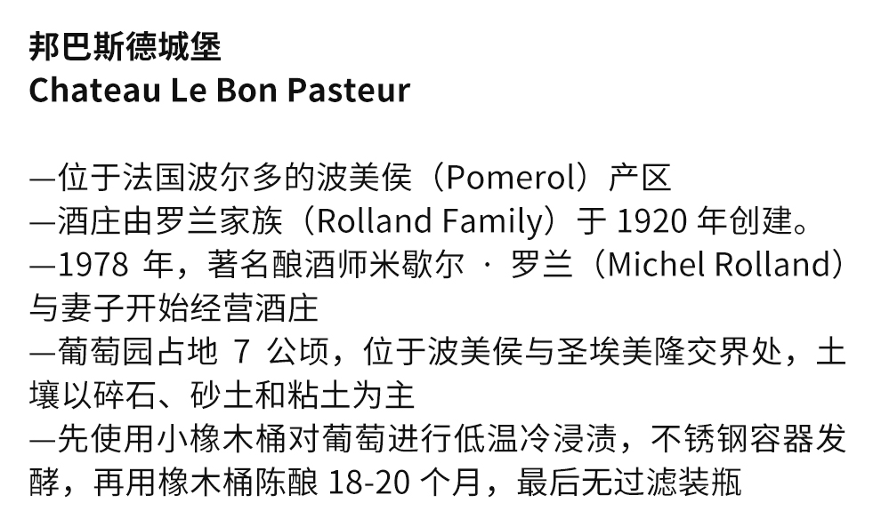 邦巴斯德酒庄主坐落在杰出的Pomerol和Saint Emilion产区边界, 以种植梅洛葡萄为主。由Joseph 和 Hermine Dupuy在1920年代创建。Le Bon Pasteur 意味牧羊人,牧羊人在圣经里拯救迷失信仰的人们。取名时是复活节下来第二个星期天,正是牧羊人日。