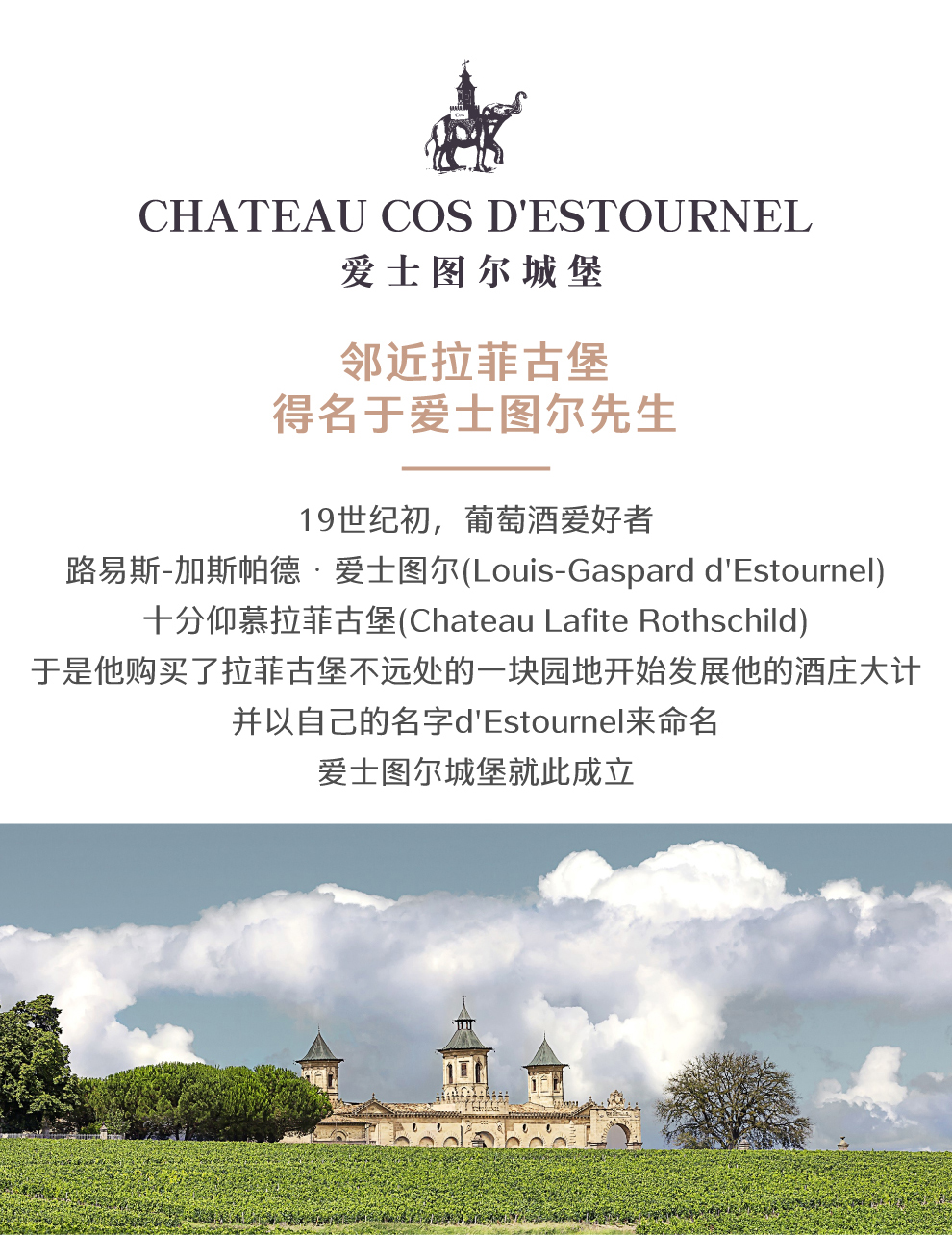 爱士图尔庄园闻名遐迩的城堡建筑同样出自创始人路易斯之手。对东方文化涉猎颇深且十分喜爱的路易斯别出心裁地将众多东方元素融合进酒庄城堡的设计中。他在酒庄城堡之上建造了雄伟的印度宝塔,宝塔之下则为华丽精美的酒窖,为爱士图尔庄园点缀上绮丽而沉静的东方色彩。此外,他还特意从桑给巴尔(Zanzibar)运回一道苏丹宫殿大门,并在城堡各处雕刻上象征着智慧的印度大象,将酒庄打造成“献给葡萄酒的一座豪华宫殿”,路易斯本人也因此被人们称为“圣埃斯泰夫大君(Maharajah of Saint-Estephe)”。如今,爱士图尔这座独具东方古韵的城堡已成为波尔多最热门的景点之一。