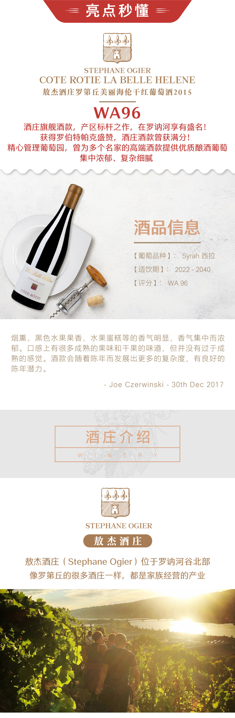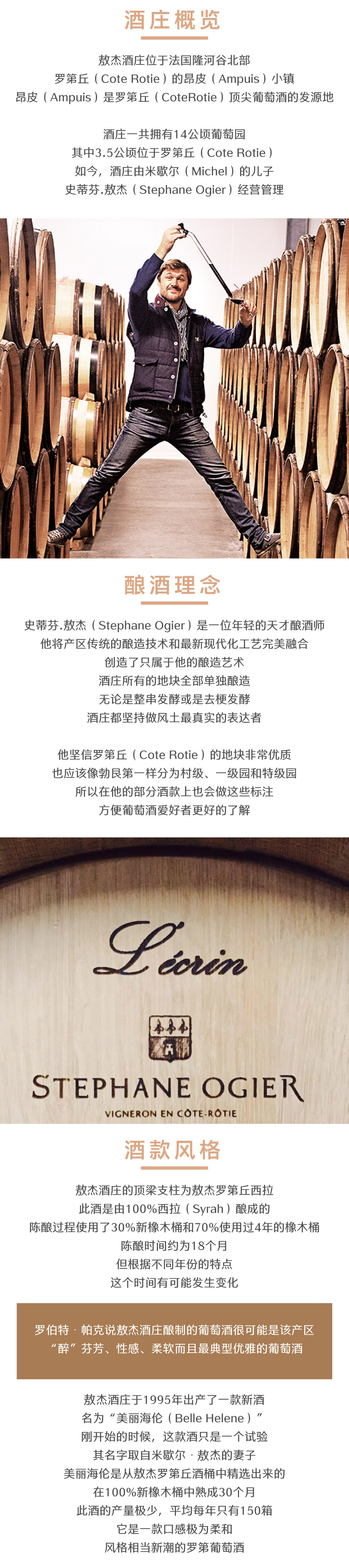 史蒂芬敖杰(Stephane Ogier)是一位年轻的天才酿酒师,他将产区传统的酿造技术和最新现代化工艺完美融合,创造了只属于他的酿造艺术。酒庄所有的地块全部单独酿造,无论是整串发酵或是去梗发酵,酒庄都坚持做风土最真实的表达者。他坚信罗蒂丘(Cote Rotie)的地块非常优质,也应该像勃艮第一样分为村级、一级园和特级园,所以在他的部分酒款上也会做这些标注,方便葡萄酒爱好者更好的了解。