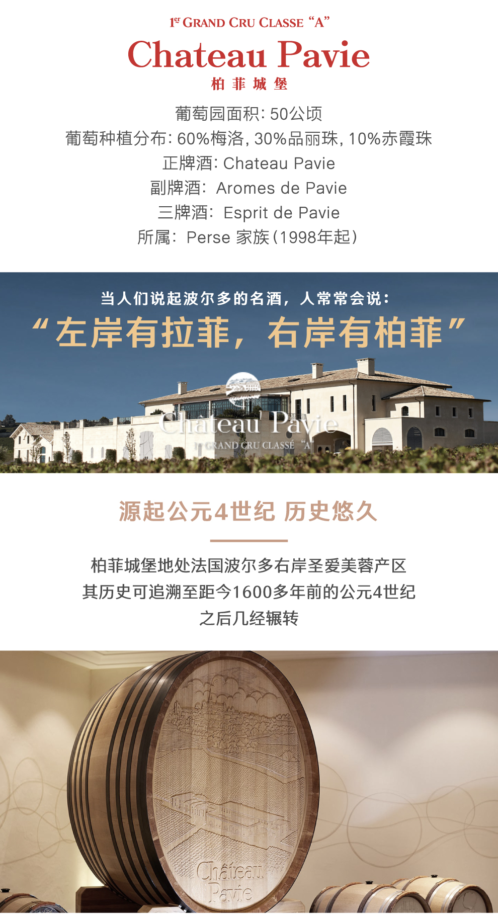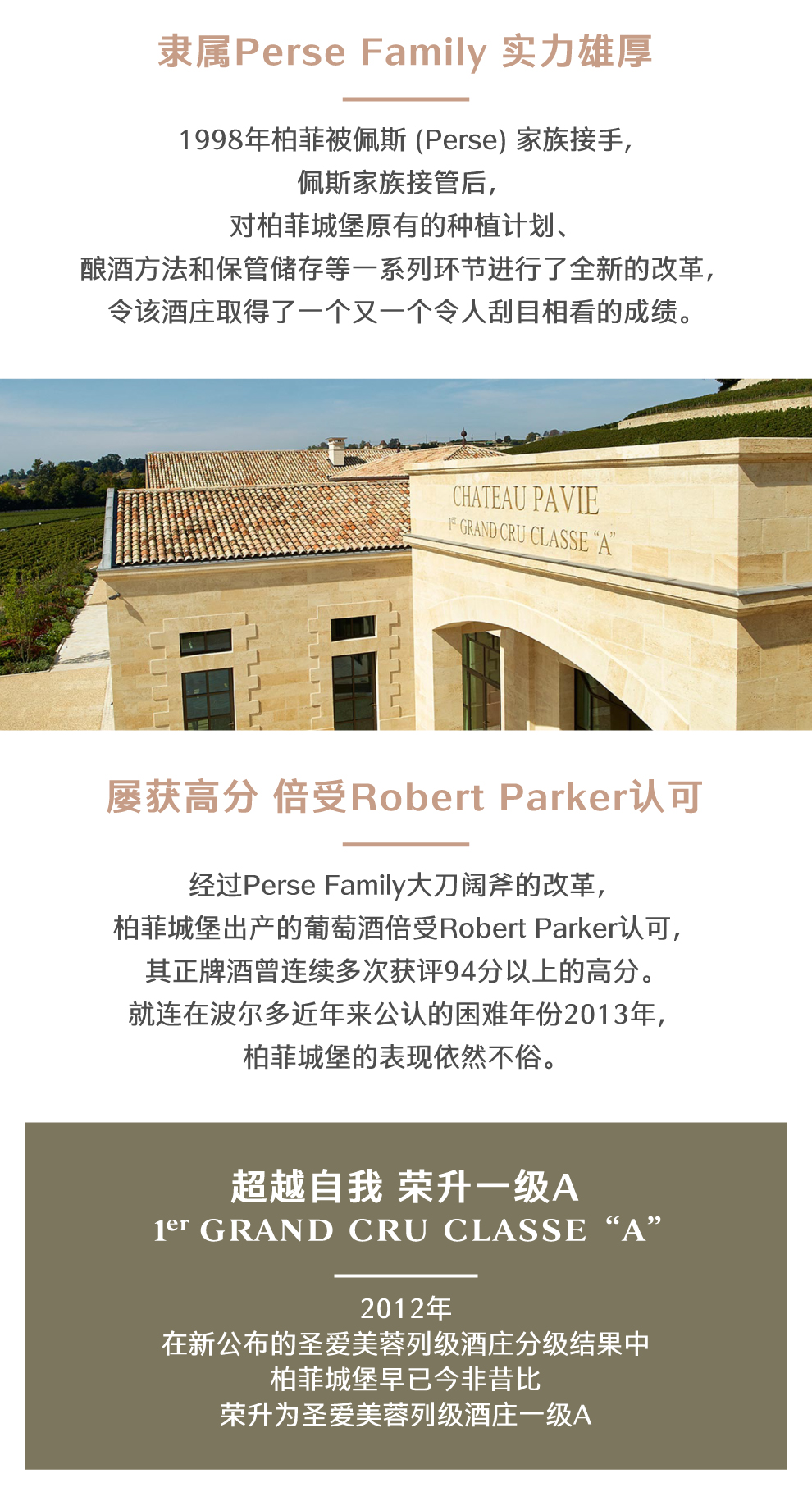 柏菲城堡地处法国波尔多右岸圣爱美蓉产区,其历史可追溯至距今1600多年前的公元4世纪。之后几经辗转1998年柏菲被佩斯 (Perse) 家族接手,佩斯家族接管后,对柏菲城堡原有的种植计划、酿酒方法和保管储存等一系列环节进行了全新的改革,令该酒庄取得了一个又一个令人刮目相看的成绩。