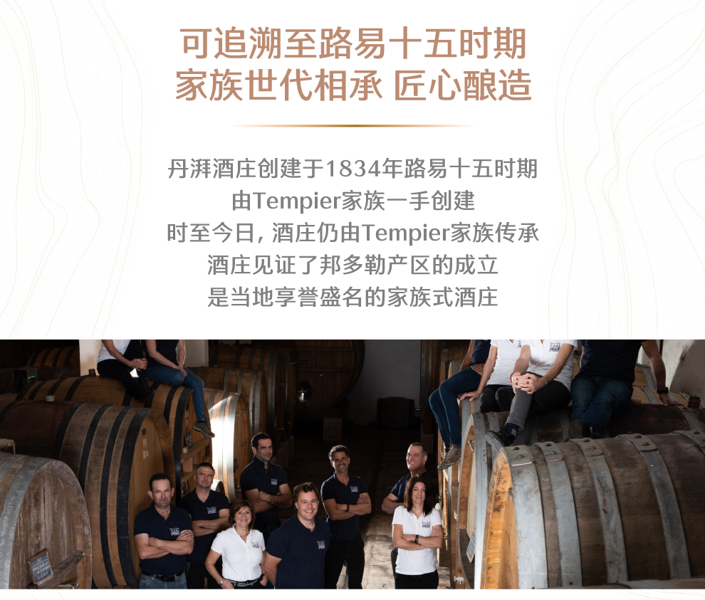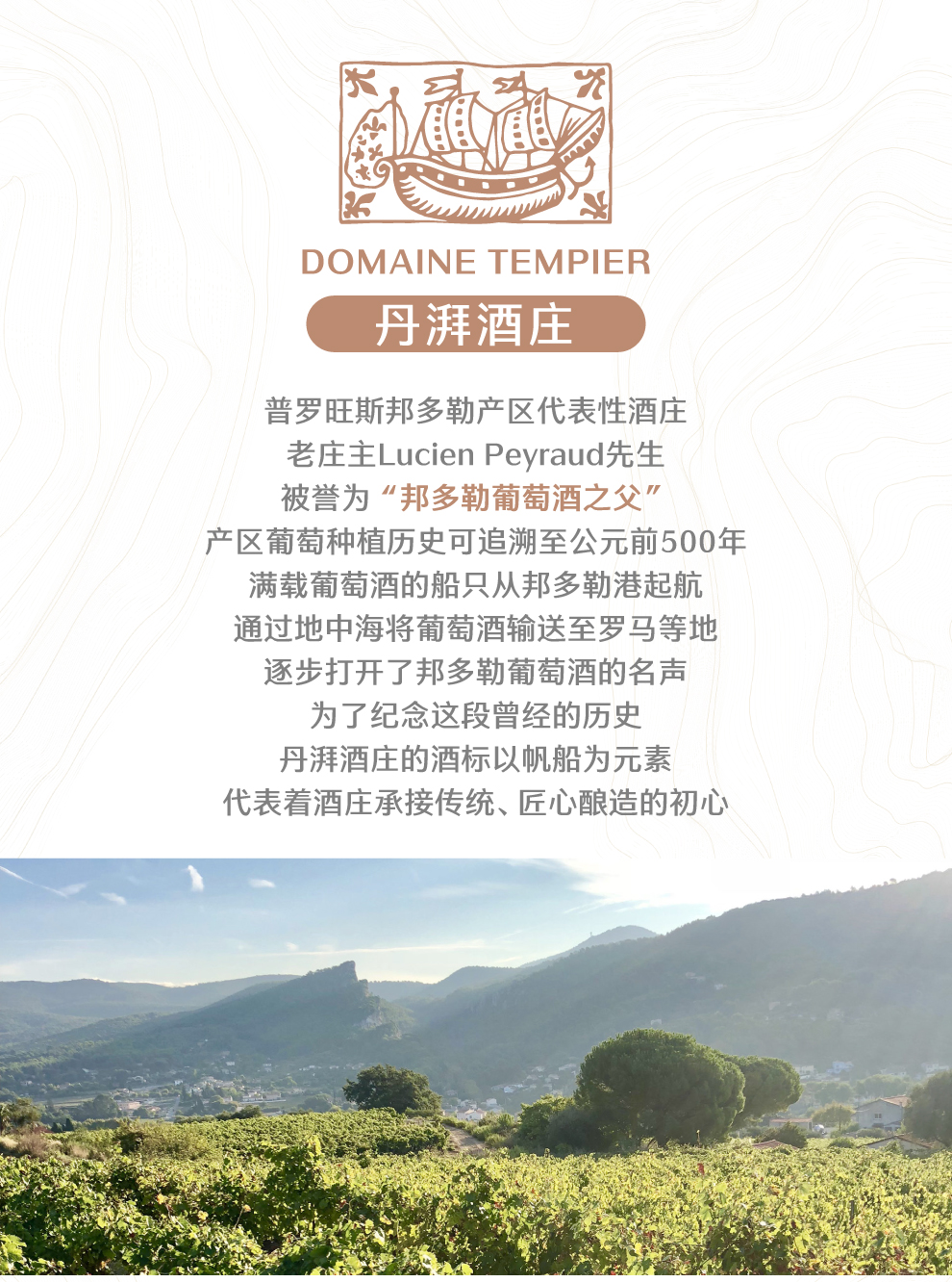 法国的历史学家认为此地区第一个葡萄园产生于公元前500年,几个世纪后,罗马人开始从该地区出口葡萄酒,装运葡萄酒的船只从附近的Bandol港起航,通过地中海输送到罗马等地。因此Domaine Tempier的酒标有个帆船。到1941年,这里通过了原产地命名的称谓。Domaine Tempier建立于1834年路易十五时代,1885年,它的产品获得了第一枚金牌。从1943年起,Domaine Tempier开始生产桃红酒,而酒庄的主人Lucien Peyraud也是当地葡萄酒协会主席协会主席。在Lucien Peyraud的努力下,该地区的葡萄酿出的葡萄酒享誉国内外,因此Lucien Peyraud成为了当地葡萄酒之父。今天酒庄的领导人是一个充满激情的年轻人Daniel Ravie, 在他的领导下酒庄仍然保持着卓越的水平。