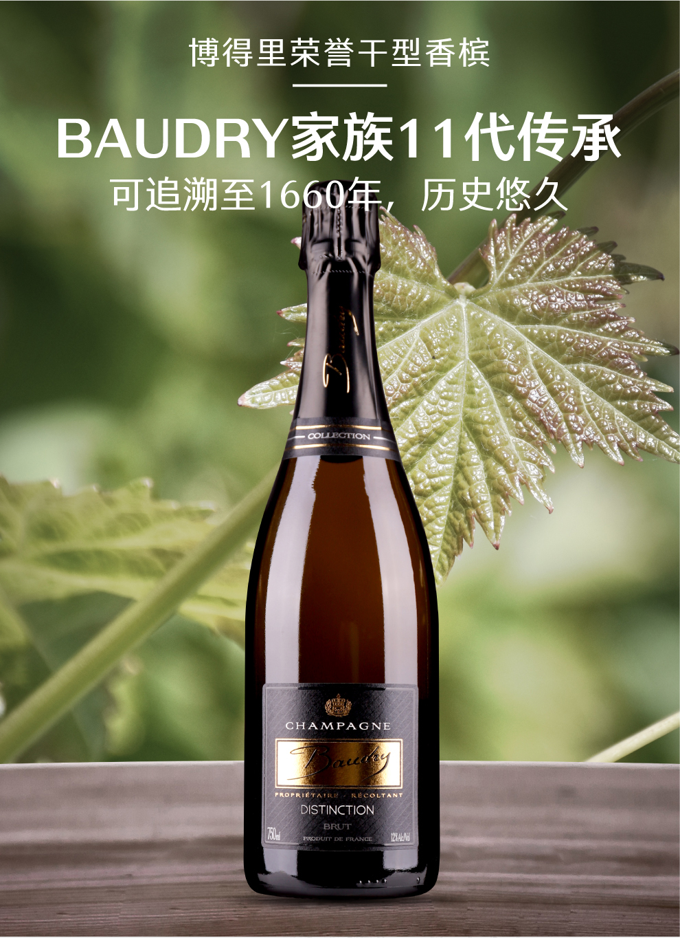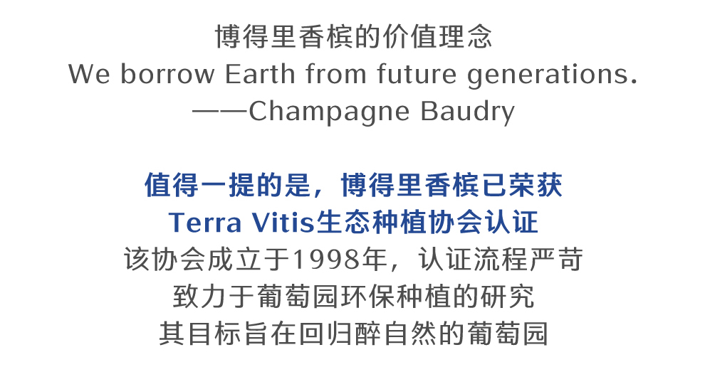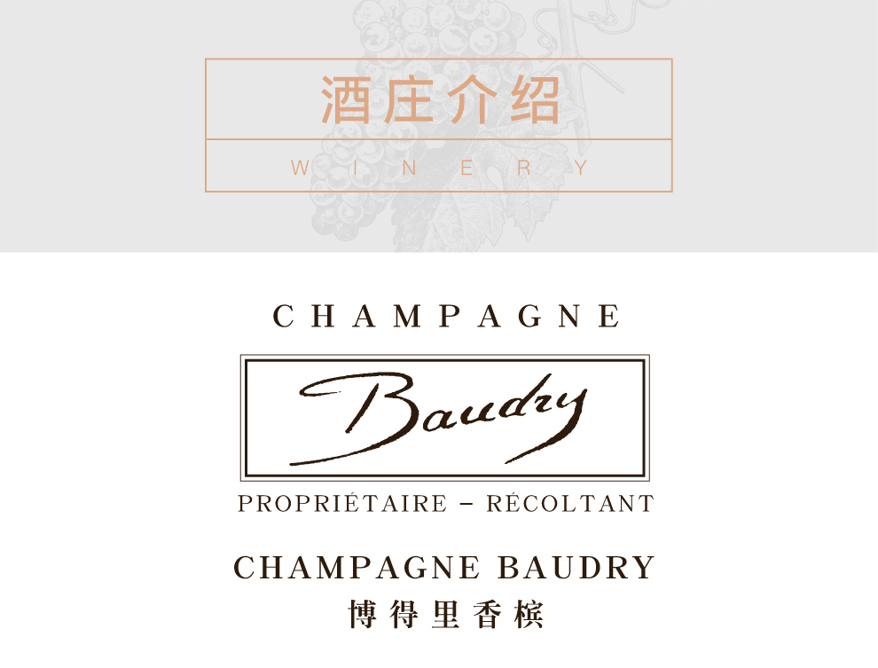 博得里香槟始创于1660年,为博得里家族(Baudry Family)所有,是巴尔丘当地一座历史十分悠久的酒庄。数百年来,博得里香槟坚持认真用心和追求优质的酿酒理念,将酒庄的优秀酿造技艺代代相传,现已传承至家族的第11代成员。作为博得里香槟的现任庄主,阿梅尔·博得里(Armel Baudry)和约瑟·博得里(Jose Baudry)兄弟两人将可持续发展的生态种植理念纳入酒庄的经营管理中,酒庄也得到了Terra Vitis生态种植协会的认证。