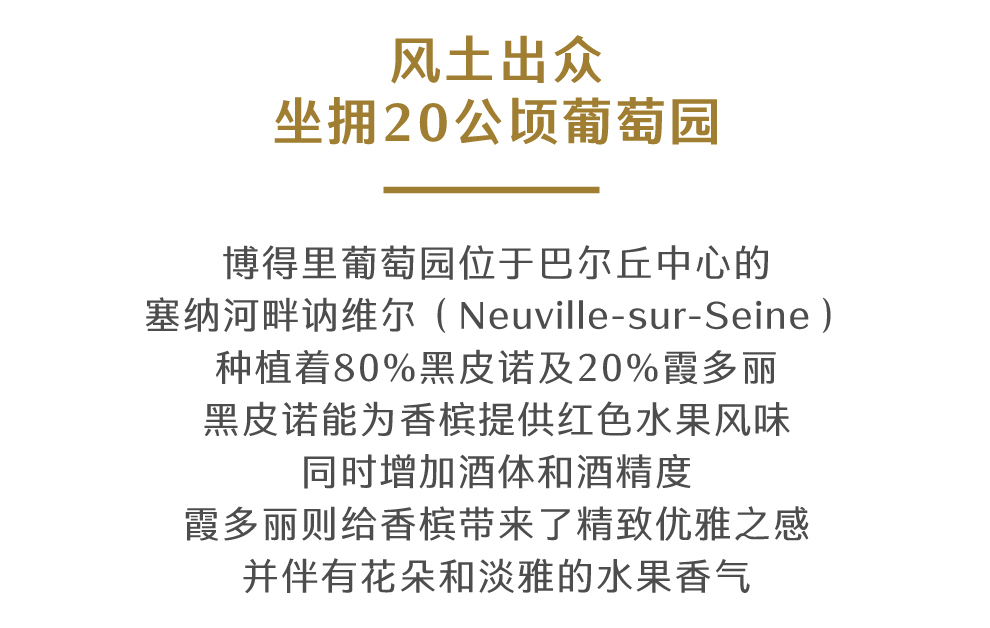 博得里香槟的葡萄园位于巴尔丘中心的塞纳河畔讷维尔(Neuville-sur-Seine),占地20公顷,地表覆盖着黏土和石灰石,深层土壤为基米里支阶板黏土。园内种植了80%的黑皮诺(Pinot Noir)和20%的霞多丽(Chardonnay),黑皮诺能为香槟提供红色水果风味,同时增加了酒体和酒精度;霞多丽则给香槟带来了精致优雅之感,伴有花朵和淡雅的水果香气。