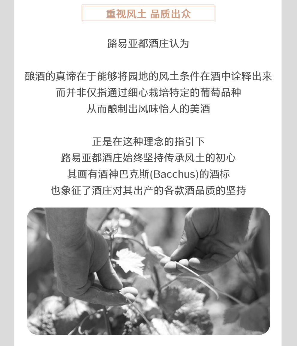对路易亚都酒庄来说,酿酒的真谛在于能够将地方的风土条件在酒中诠释出来,而并非仅指细心栽培特定的葡萄品种,从而酿制出风味怡人的美酒。正是在这种理念的指引下,路易亚都成为了卓越品质的代名词。其画有酒神巴克斯(Bacchus)的酒标,象征着酒庄对其出产的各款酒品质的坚持,不管是产区级还是特级园级别的佳酿,路易亚都酒庄的品质都备受肯定。