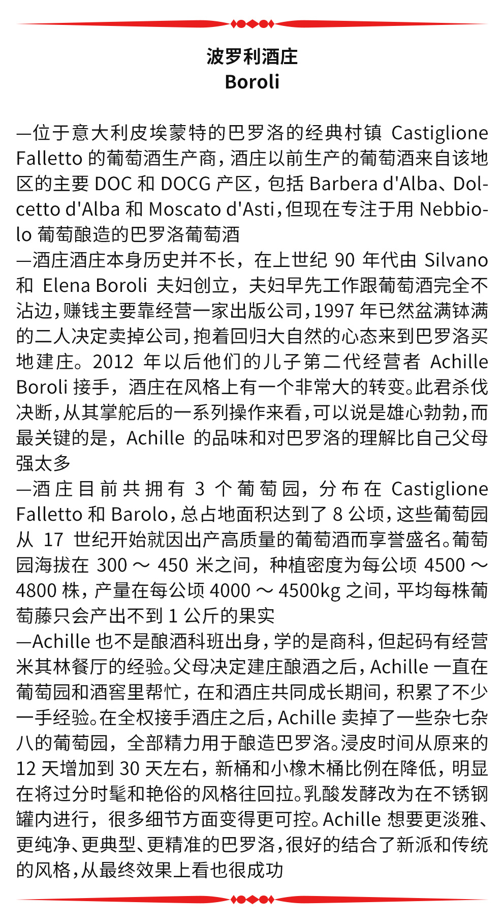 波罗利酒庄(BOROLI)创始于二十世纪九十年代,酒庄严谨的理念和酒款优秀的品质使其很快在业内建立了极高的声誉。酒庄的历史可以追溯到1831年,其前身为皮埃蒙特的一家族企业,涉足纺织业、出版行业和葡萄种植产业。上世纪九十年代,Silvano Boroli和Elena Boroli在家族原本葡萄种植产业的基础上,扩展业务,共同建立了波罗利酒庄。
