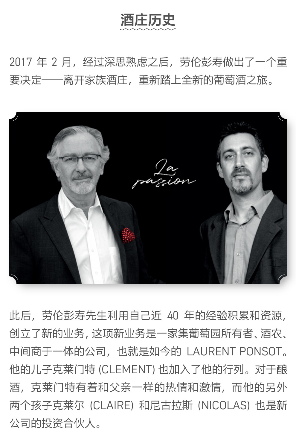 离开彭寿酒庄后,劳伦彭寿先生利用自己近40年的经验积累和资源,创立了新的业务,这项新业务是一家集葡萄园所有者、酒农、中间商于一体的公司。他的儿子克莱门特(Clement)也加入了他的行列,克莱门特对酿酒有和他一样的热情和激情,而他的另外两个孩子克莱尔(Claire)和尼古拉斯(Nicolas)也是新公司的投资合伙人。