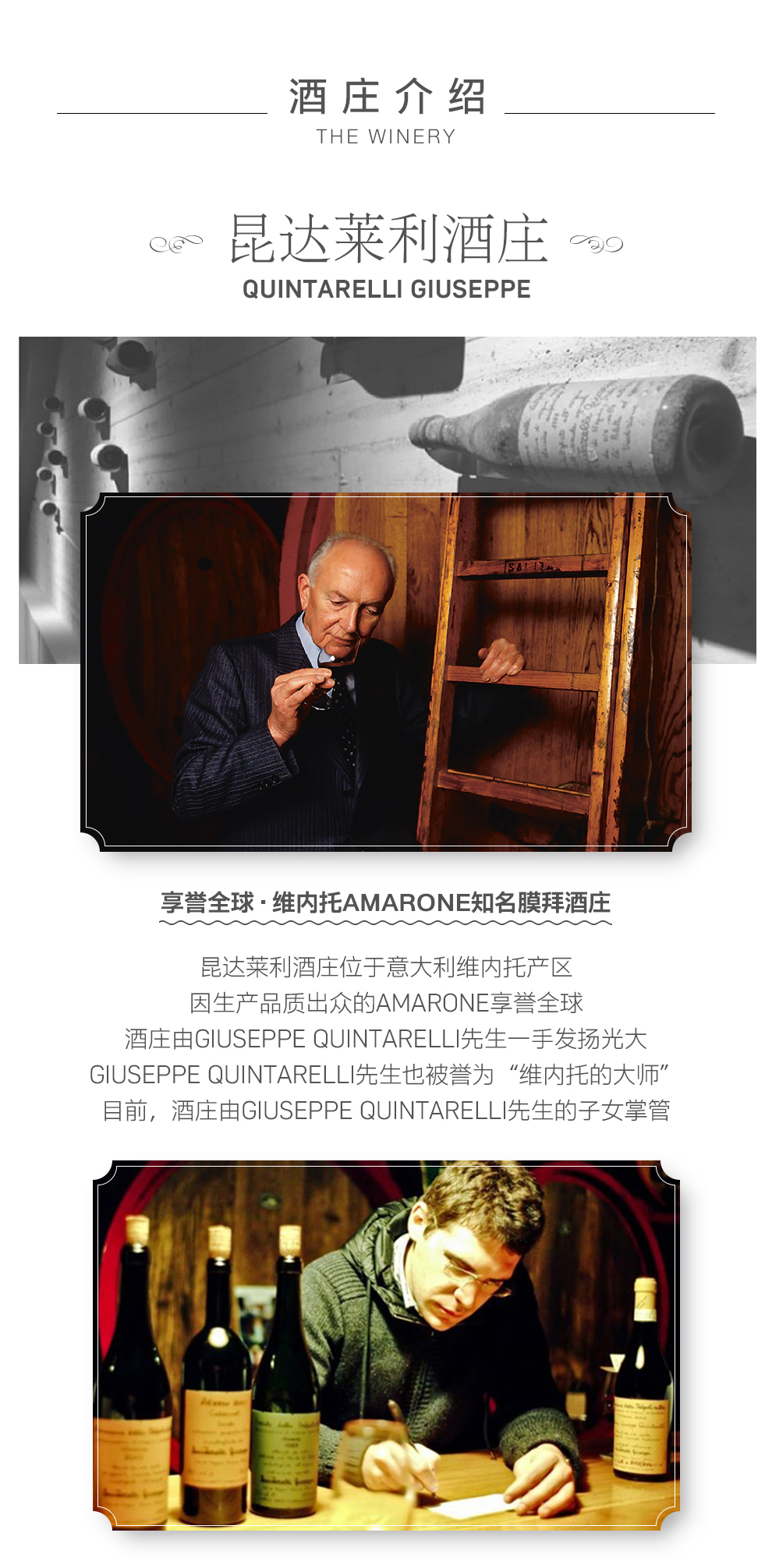 葡萄酒发烧友一提到朱塞佩·昆达莱利酒庄(Giuseppe Quintarelli),最先联想到的词就是Amarone。这种联想不难理解:在酒庄不做任何营销推广的情况下,Giuseppe Quintarelli生产的Amarone单凭口耳相传就能成为意大利最受欢迎的酒款。这座享誉世界的酒庄门口连块指示牌都没有,但其伟大的作品却得到世人的顶礼膜拜。 这一切的幕后英雄当然是老庄主Giuseppe Quintarelli本人了。1927年,Giuseppe Quintarelli就出生于庄园内。作为一名自学成材的酿酒师,上世纪50年代,他从他父亲Silvio那里接管了酒庄的生产工作,并尽其一生致力于提升酒质。