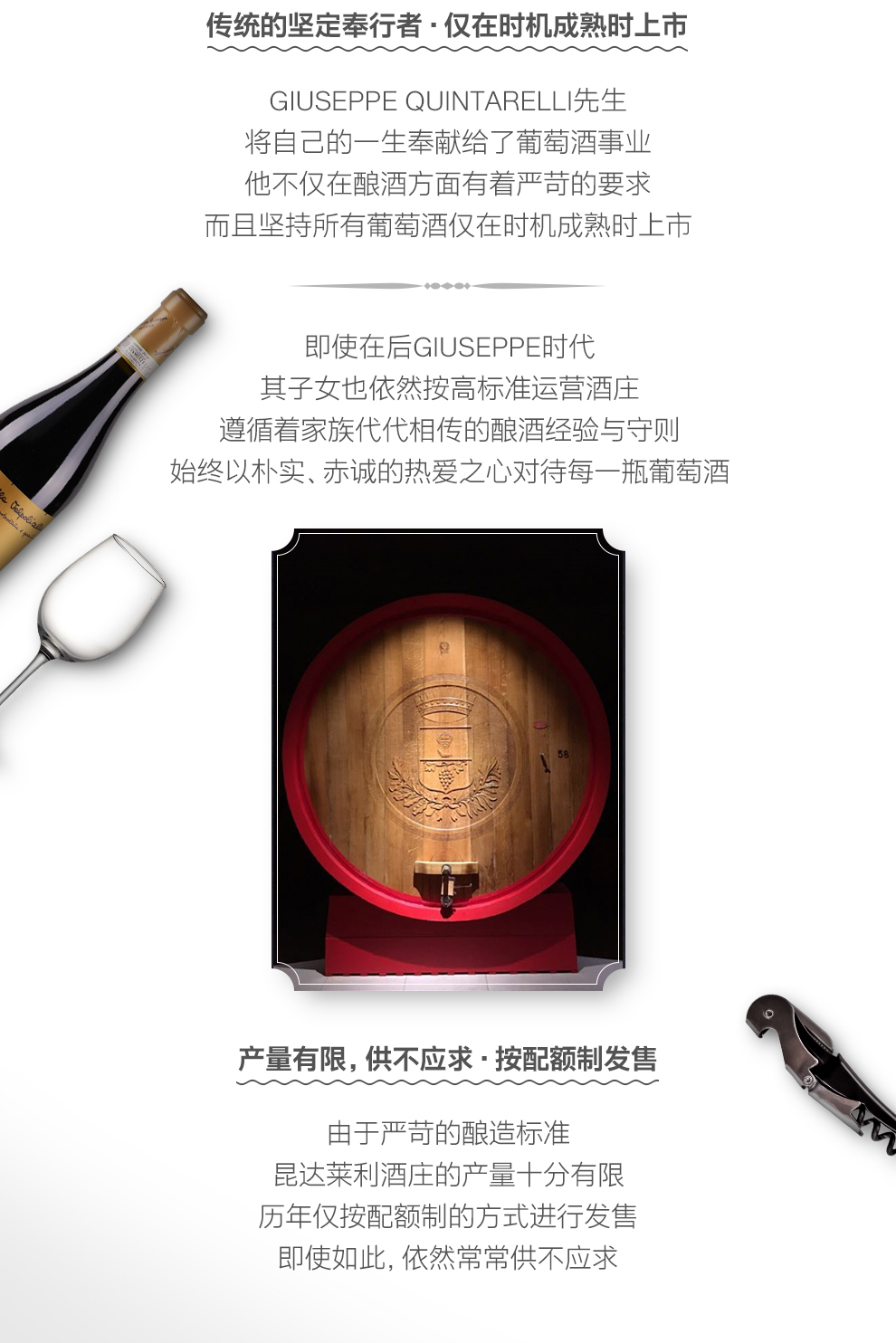 作为传统的坚定奉行者,后Giuseppe时代的Quintarelli酒庄仍坚持以Giuseppe的标准和守则进行酿酒,而这些实践出的经验又是Giuseppe从他父亲和祖父那里学来的。昆达莱利历来按配额制供应,而且常常供不应求,每人只能分到很少的配额,即便是渠道很灵通的资深葡萄酒爱好者也时常觉得昆达莱利的酒千金难求。昆达莱利酒庄产量十分有限的Amarone, Recioto 和Valpolicella是真正引发人思考的葡萄酒,让人放慢脚步,变得沉默。昆达莱利的酒让人谦虚,因为它与世间的其他不同。
