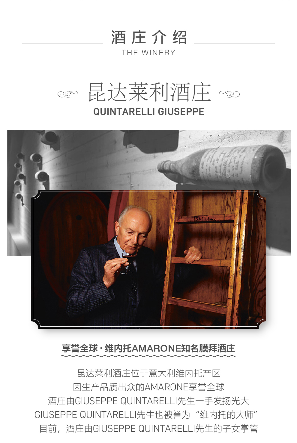 昆达莱利酒庄是威内托产区内最重要的生产商之一,且在Amarone酒上有绝对的威望并处于膜拜的位置。酒庄的创始人兼活招牌Giuseppe Quintarelli先生,人称Bepi, 更是为威内托的红酒树立了标准,这其中包含了Recioto, Valpolicella Superieure等各个级别的酒。Giuseppe老先生于2012年1月去世,享年84岁,她的妻子也于一年后离世。