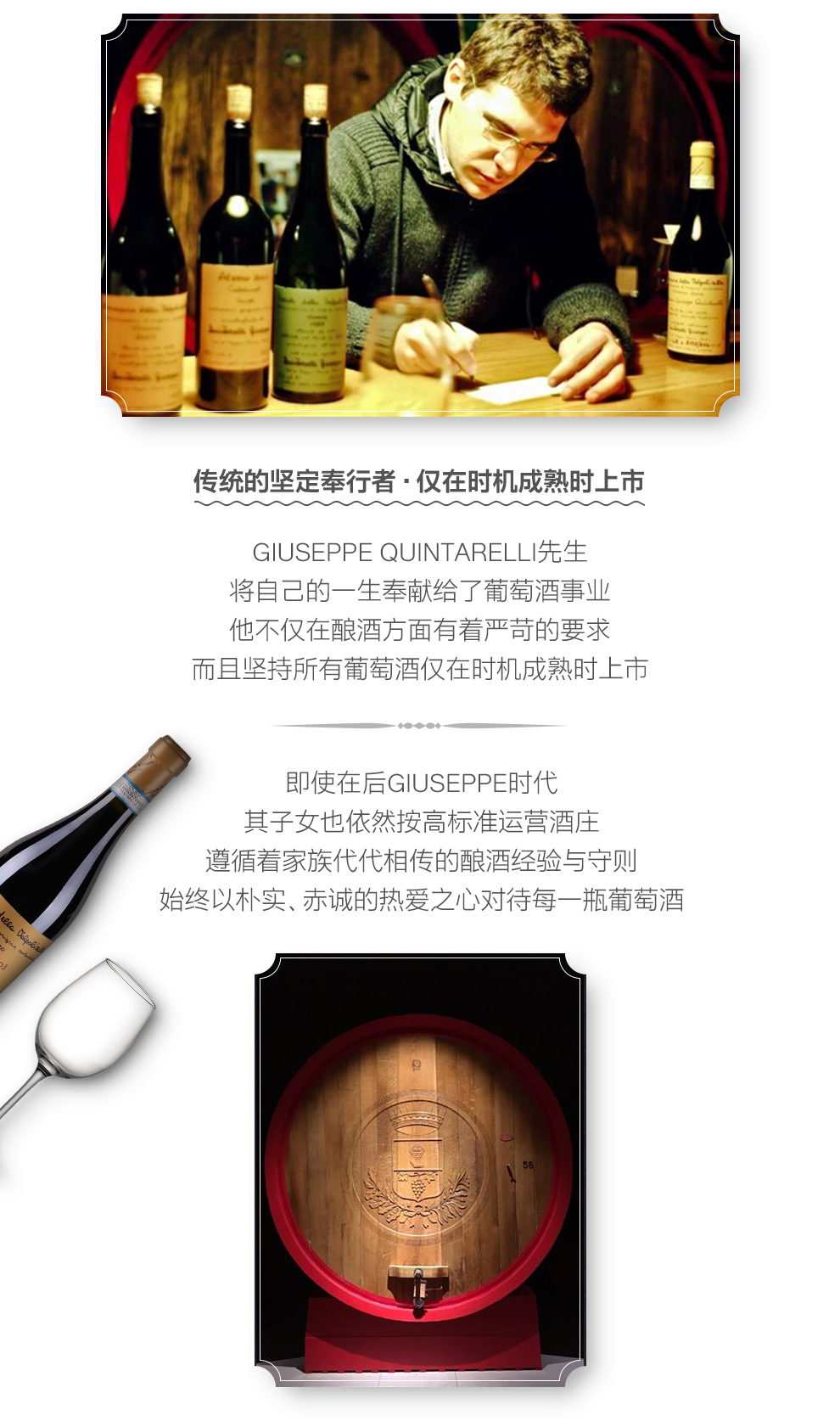 作为传统的坚定奉行者,后Giuseppe时代的Quintarelli酒庄仍坚持以Giuseppe的标准和守则进行酿酒,而这些实践出的经验又是Giuseppe从他父亲和祖父那里学来的。昆达莱利历来按配额制供应,而且常常供不应求,每人只能分到很少的配额,即便是渠道很灵通的资深葡萄酒爱好者也时常觉得昆达莱利的酒千金难求。昆达莱利酒庄产量十分有限的Amarone, Recioto 和Valpolicella是真正引发人思考的葡萄酒,让人放慢脚步,变得沉默。昆达莱利的酒让人谦虚,因为它与世间的其他不同。