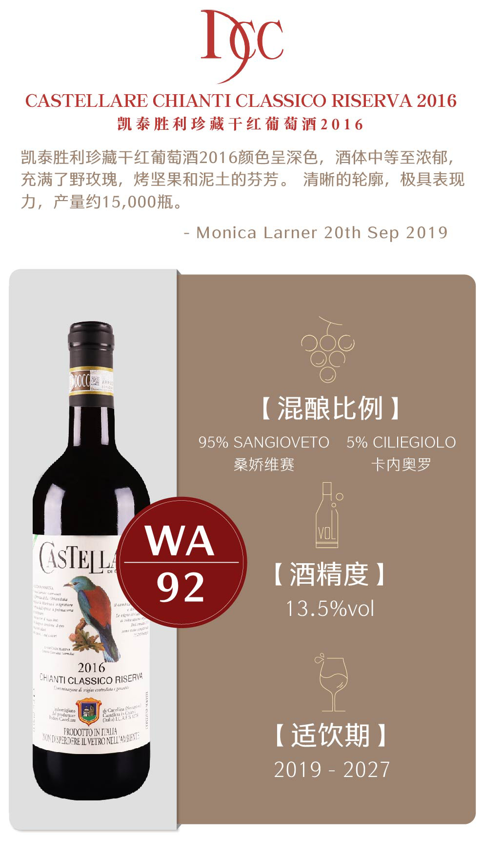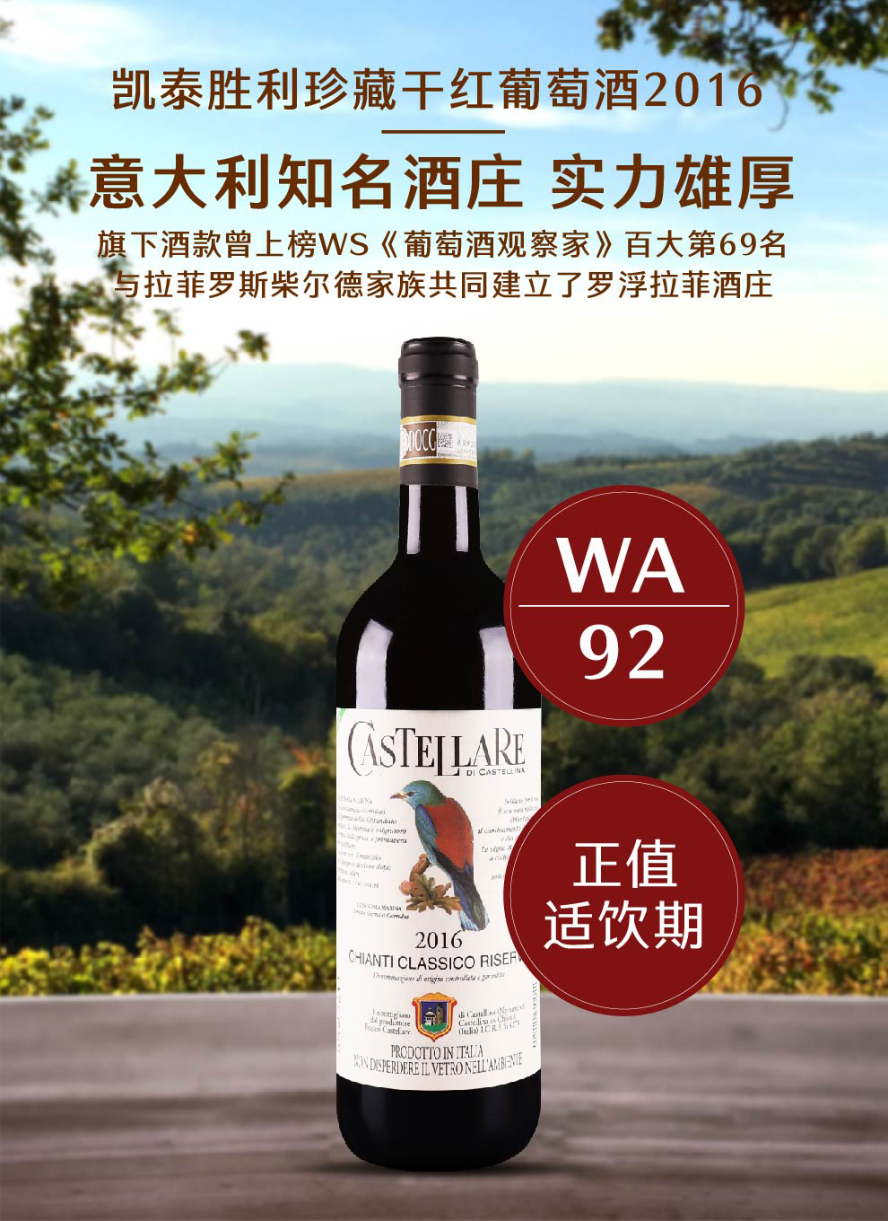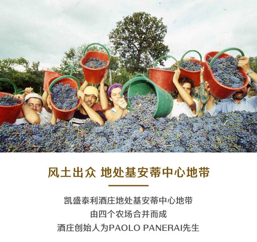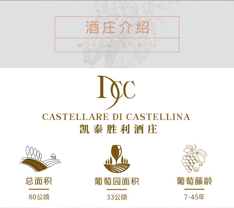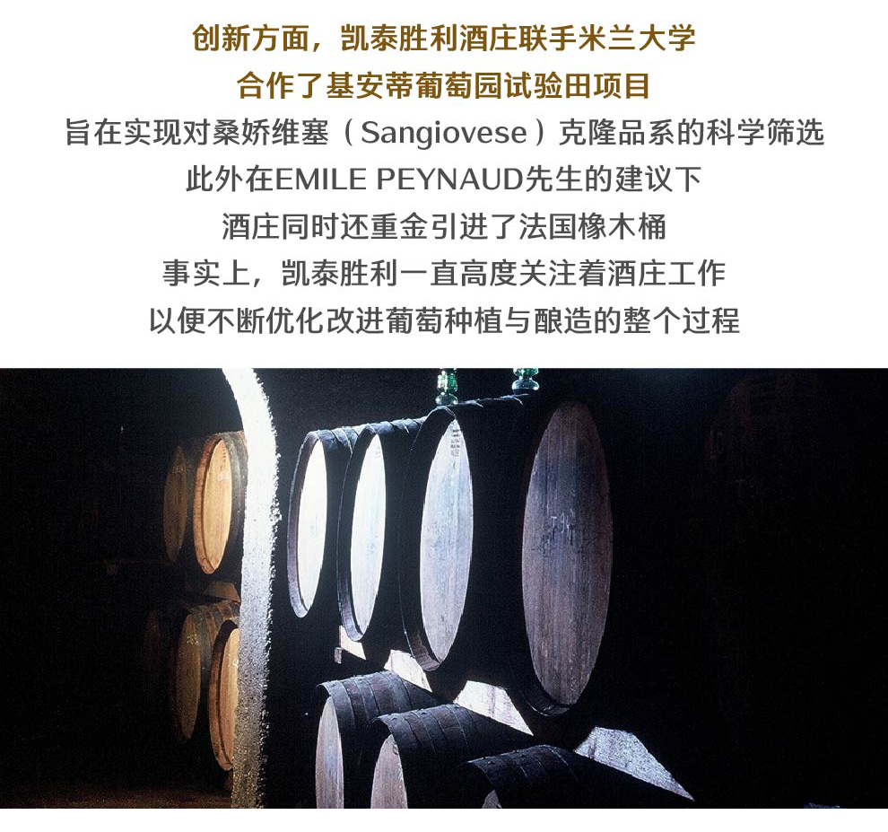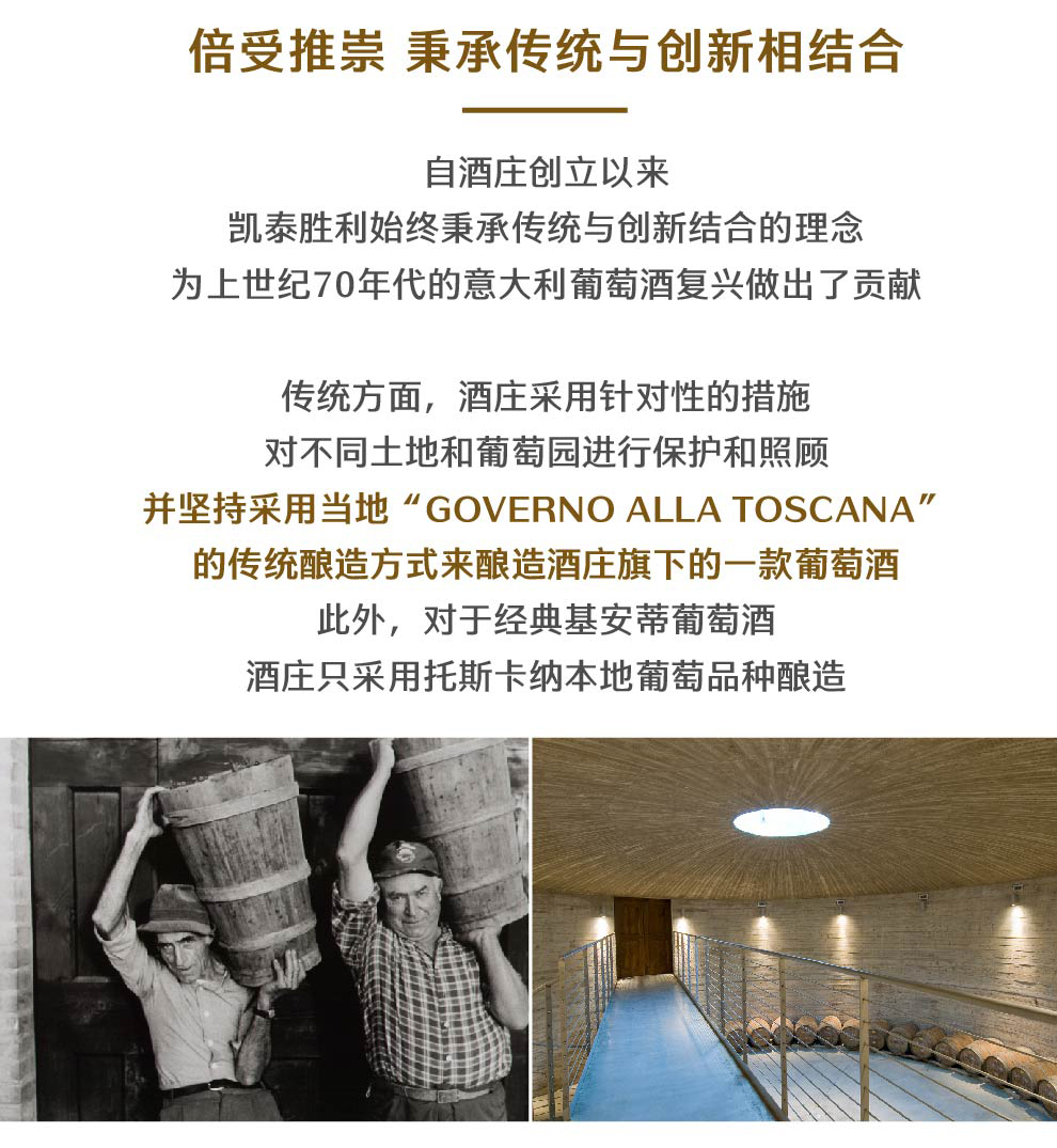凯泰胜利酒庄坐落在经典基安帝(Chianti Classico)的中心地带,占地80公顷。它于1968年由五个农场合并而成,其葡萄园占地面积为33公顷,位于海拔高度为370米的地方。酒庄葡萄园内的葡萄树年龄在5至30年之间,所栽培的品种包括桑娇维塞(Sangiovese)和赤霞珠(Cabernet Sauvignon)等。