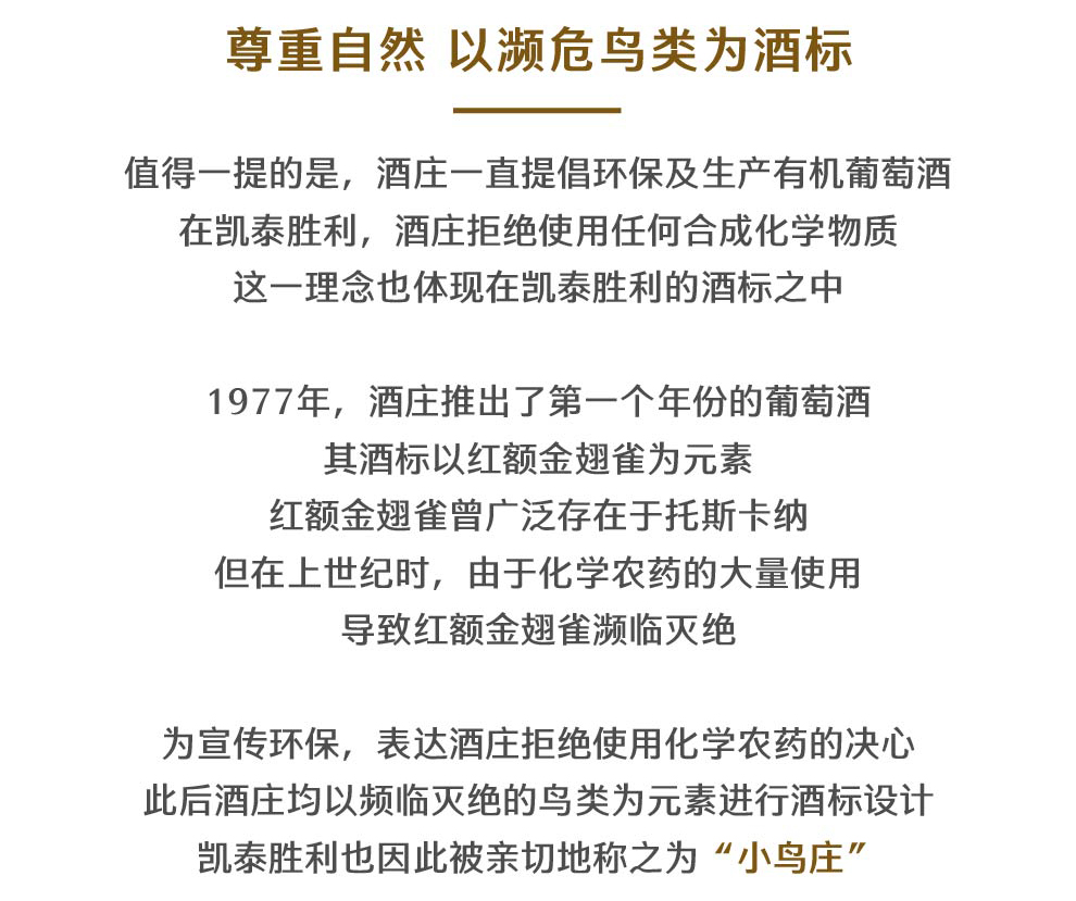 凯泰胜利酒庄独树一帜的鸟标非常有意思,这些鸟类都是将在减低地区濒临灭绝的品种,为了引起了大家对环境的关注,而作为酒标使用。在凯泰·胜利酒庄,杀虫剂等化学药剂,或者狩猎活动在这地区是严令禁止的。这样保持原生态的种植环境使得许多频临消失的物种逐渐重新出现了在这片土地。酒庄利用这种方式宣传了保护环境,尊重自然的商业理念,在行业内树立了一个积极的榜样。