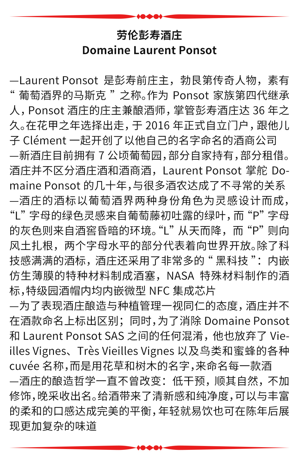 劳伦彭寿(Laurent ponsot)的负责人为劳伦彭寿先生,他曾经在勃艮第著名的彭寿酒庄(Domaine Ponsot)担任庄主。