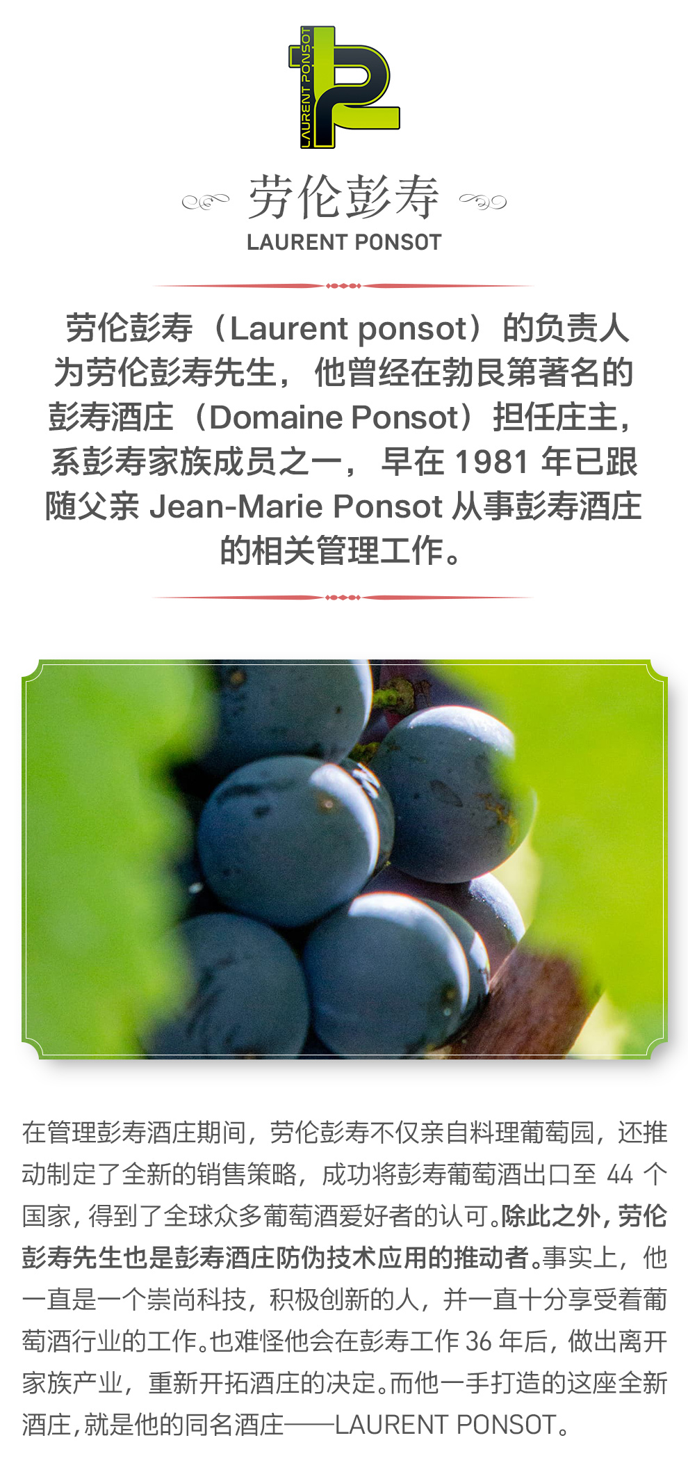 劳伦彭寿(Laurent ponsot)的负责人为劳伦彭寿先生,他曾经在勃艮第著名的彭寿酒庄(Domaine Ponsot)担任庄主。