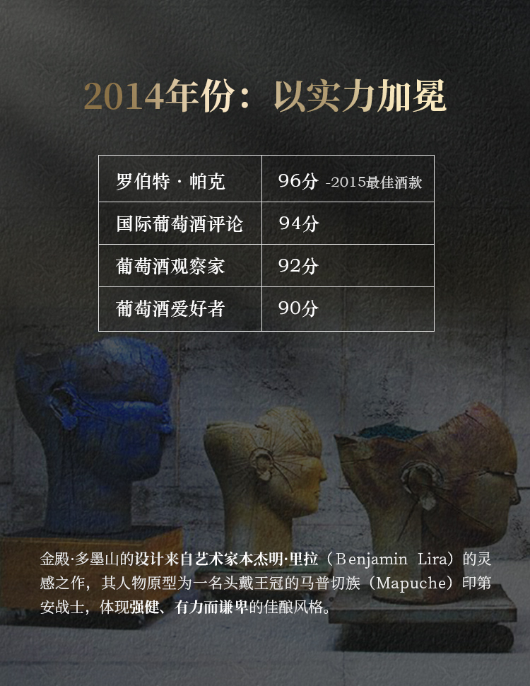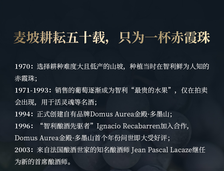 • 产品名称:【2014年份】智利十八罗汉之一 车库酒王 金殿·多墨山 Domus Aurea 赤霞珠干红葡萄酒