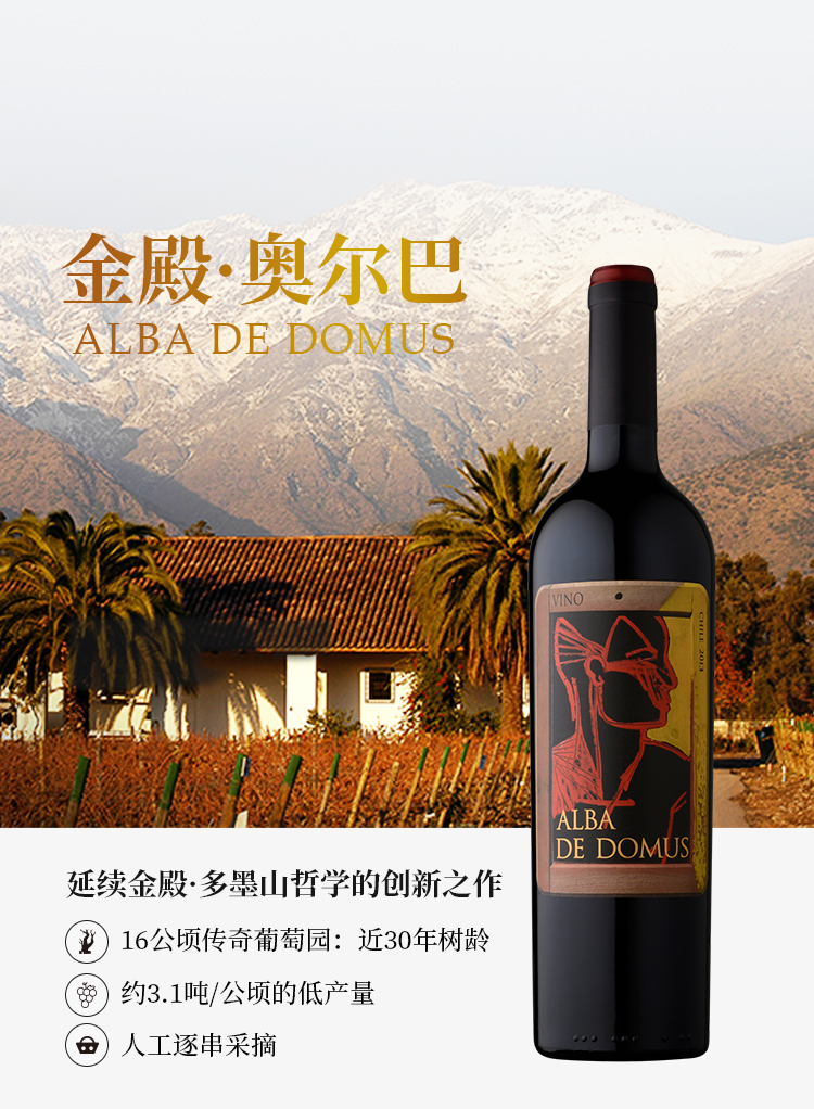 • 产品名称:【2013年份】智利车库酒庄 金殿·奥尔巴 Alba de Domus 赤霞珠干红葡萄酒