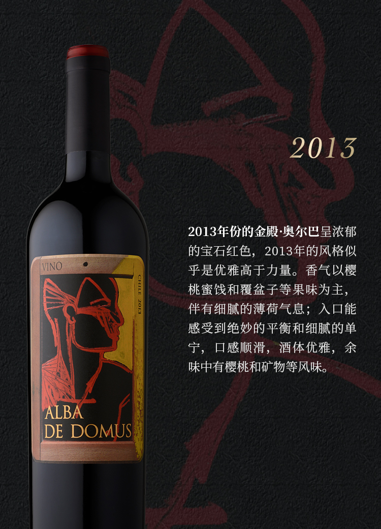 【2013年份】智利车库酒庄 金殿·奥尔巴 Alba de Domus 赤霞珠干红葡萄酒