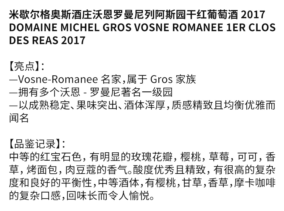米歇尔格奥斯酒庄(Domaine Michel Gros)位于法国的勃艮第的沃恩-罗曼尼(Vosne-Romanée)产区,酒庄历史悠久,是勃艮第产区知名的家族性酒庄。