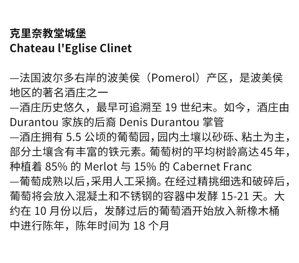 克里奈教堂城堡的正牌酒为克里奈教堂城堡红葡萄酒(Chateau l'Eglise-Clinet, Pomerol, France)。城堡酿制的葡萄酒口感浓缩而丰富,酒体丰满,带有纯正的果香和奇特的香料味,尤为新鲜和美妙,在波尔多葡萄酒中显得格外独特。近些年来,在酒价一路飙升的同时,品质也是步步高升。如今,它已步入了波美侯顶级城堡之列。