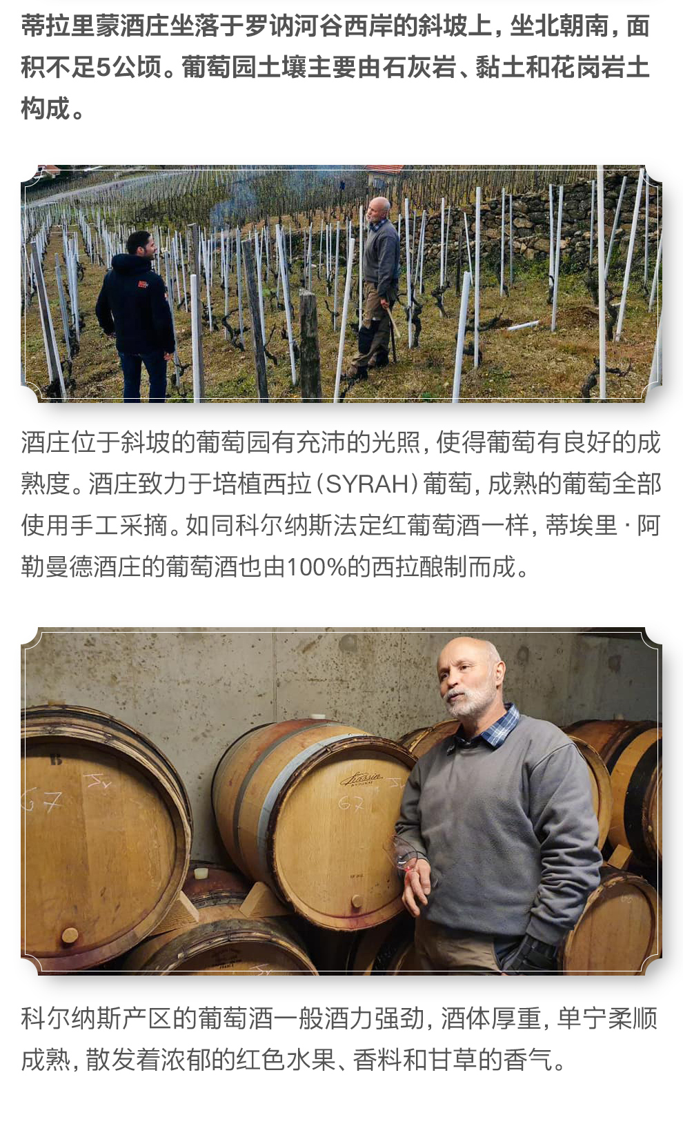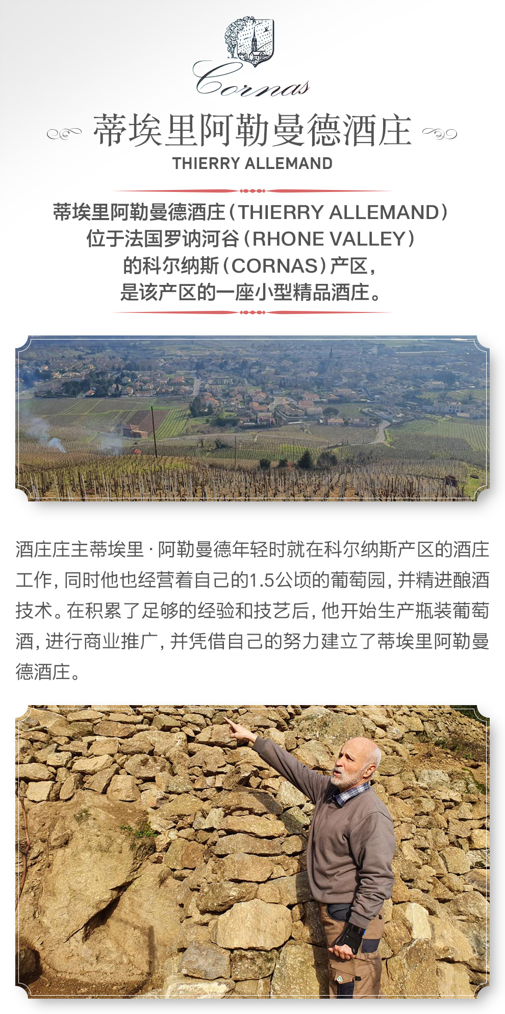 蒂埃里阿勒曼德酒庄(Thierry Allemand)位于法国罗讷河谷(Rhone Valley)的科尔纳斯(Cornas)产区,是该产区的一座小型精品酒庄。