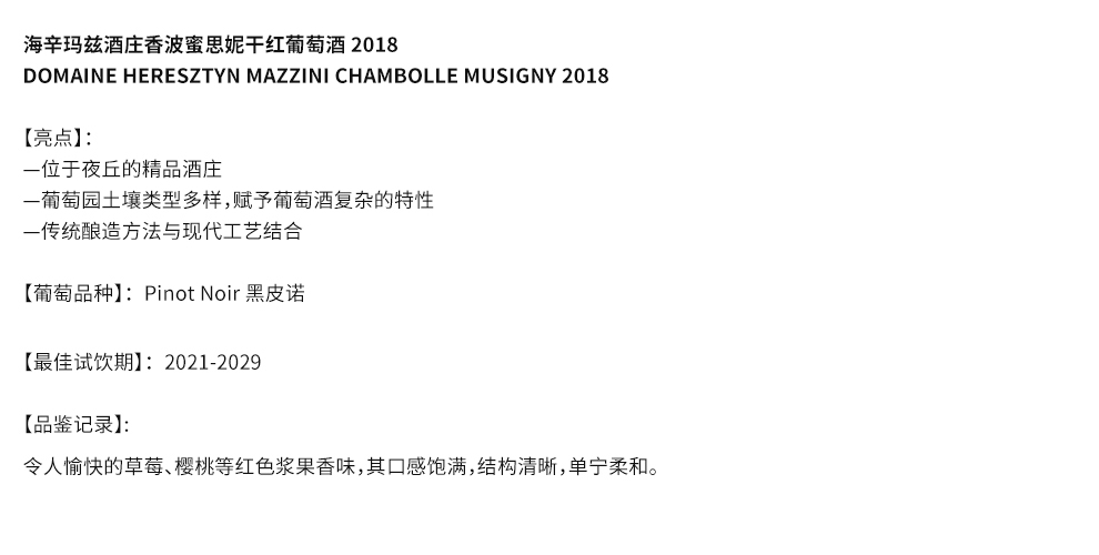 海辛-玛兹酒庄由弗洛伦斯·海辛-玛兹(Florence Heresztyn-Mazzini)和西蒙·海辛-玛兹(Simon Heresztyn-Mazzini)夫妇共同创立。在热夫雷-香贝丹(Gevrey-Chambertin)的一个家庭葡萄园工作十年以后,他们决定开启自己的新征程,海辛-玛兹酒庄由此诞生。该酒庄于2012年发布了第一款酒。
