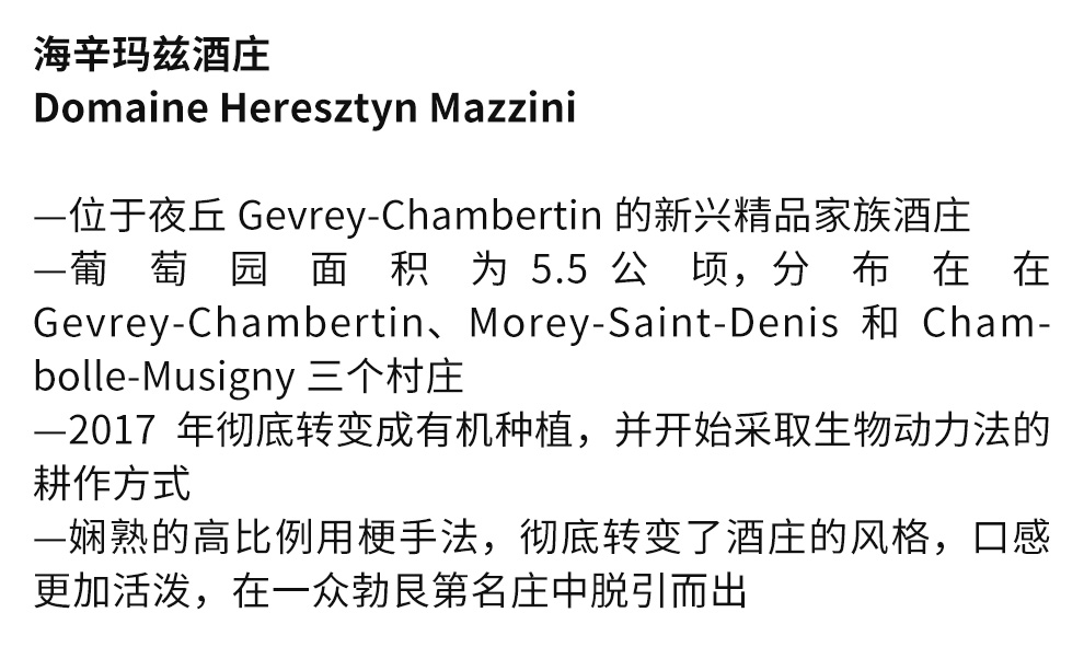 海辛-玛兹酒庄由弗洛伦斯·海辛-玛兹(Florence Heresztyn-Mazzini)和西蒙·海辛-玛兹(Simon Heresztyn-Mazzini)夫妇共同创立。在热夫雷-香贝丹(Gevrey-Chambertin)的一个家庭葡萄园工作十年以后,他们决定开启自己的新征程,海辛-玛兹酒庄由此诞生。该酒庄于2012年发布了第一款酒。