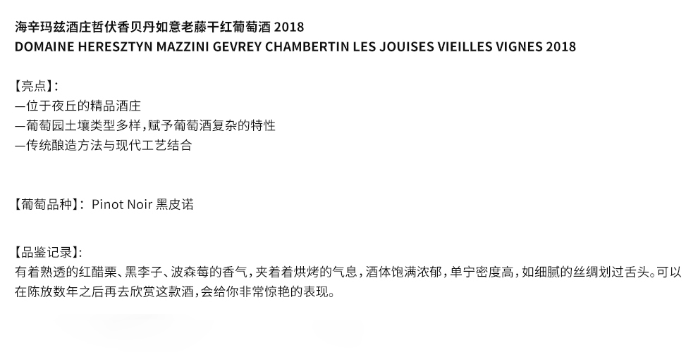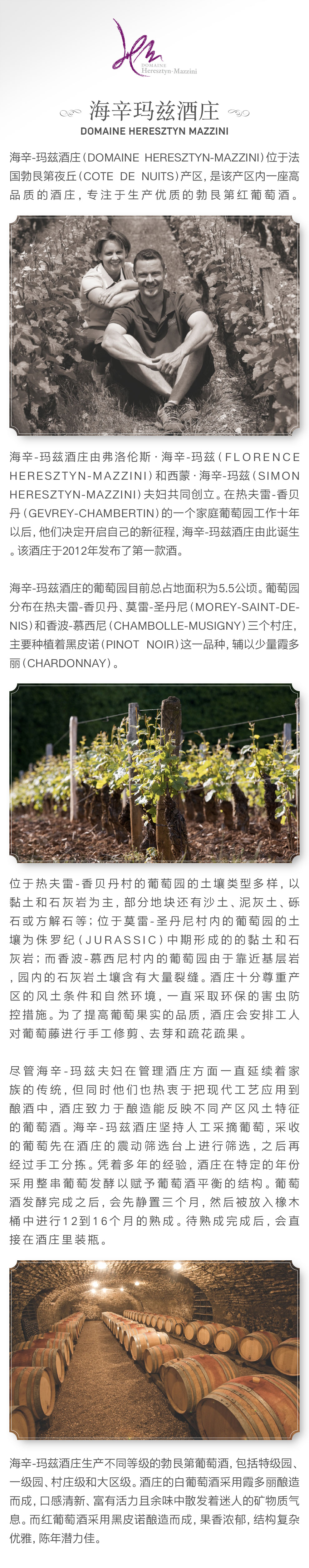 海辛-玛兹酒庄由弗洛伦斯·海辛-玛兹(Florence Heresztyn-Mazzini)和西蒙·海辛-玛兹(Simon Heresztyn-Mazzini)夫妇共同创立。在热夫雷-香贝丹(Gevrey-Chambertin)的一个家庭葡萄园工作十年以后,他们决定开启自己的新征程,海辛-玛兹酒庄由此诞生。该酒庄于2012年发布了第一款酒。