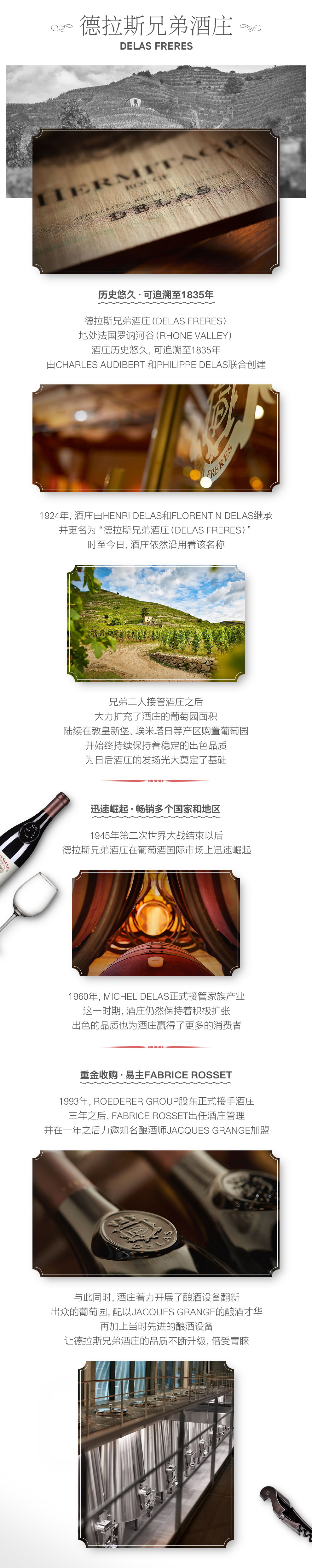 德拉斯兄弟酒庄的历史可以追溯到1835年,当时,创始人查理斯·奥迪伯特(Charles Audibert )和菲利普·德拉斯(Philippe Delas )共同买下了图尔农的一家葡萄酒公司,并将其改名为“奥迪伯特和德拉斯兄弟酒庄(Audibert et Delas)”。1924年,亨利·德拉斯(Henri Delas)和弗罗伦丁·德拉斯(Florentin Delas)接手酒庄并将酒庄改名为“德拉斯兄弟酒庄(Delas Freres)”,并一直沿用至今。两兄弟接手酒庄之后,继续扩张酒庄的葡萄园,陆续在教皇新堡(Chateauneuf-du-Pape)和埃米塔日(Hermitage)等地区买下了葡萄园,持续生产品质稳定的葡萄酒。
