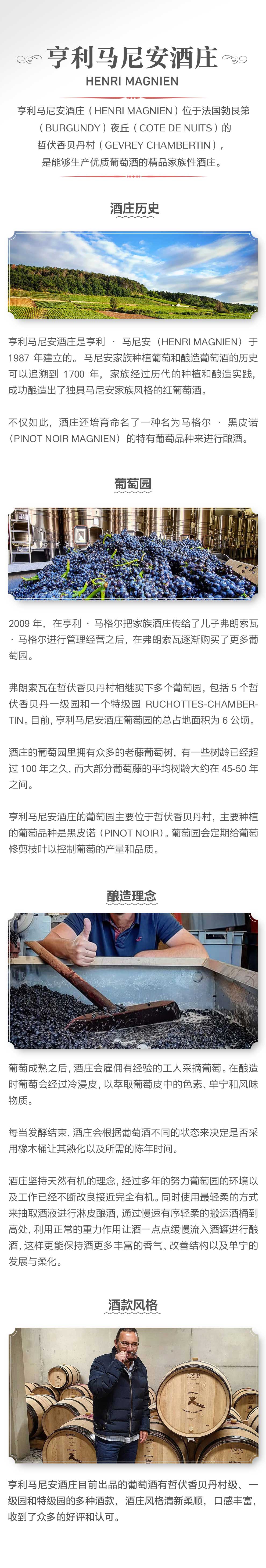 亨利马尼安酒庄目前出品的葡萄酒有哲伏香贝丹村级、一级园和特级园的多种酒款,酒庄风格清新柔顺,口感丰富,收到了众多的好评和认可。