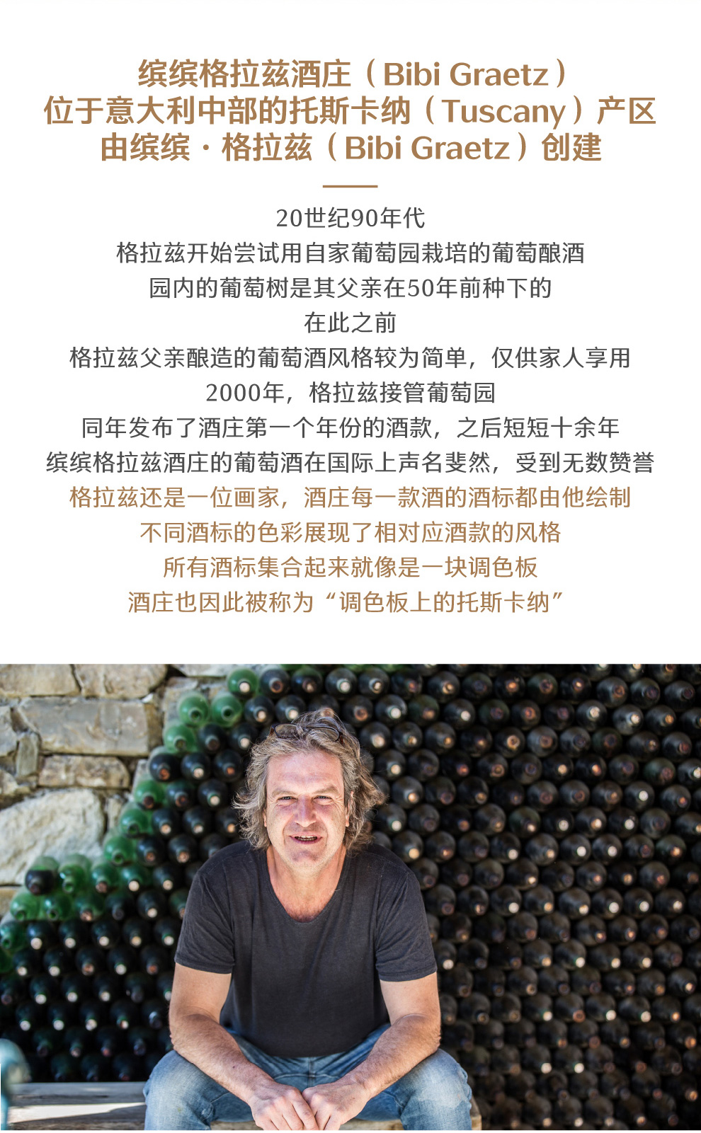 20世纪90年代,格拉兹开始尝试用自家葡萄园栽培的葡萄酿酒,园内的葡萄树是其父亲在50年前种下的。在此之前,格拉兹父亲酿造的葡萄酒风格较为简单,仅供家人享用。2000年,格拉兹接管葡萄园,同年发布了酒庄第一个年份的酒款,之后短短十余年,缤缤格拉兹酒庄的葡萄酒在国际上声名斐然,受到无数赞誉。格拉兹还是一位画家,酒庄每一款酒的酒标都由他绘制,不同酒标的色彩展现了相对应酒款的风格,所有酒标集合起来就像是一块调色板,酒庄也因此被称为“调色板上的托斯卡纳”。