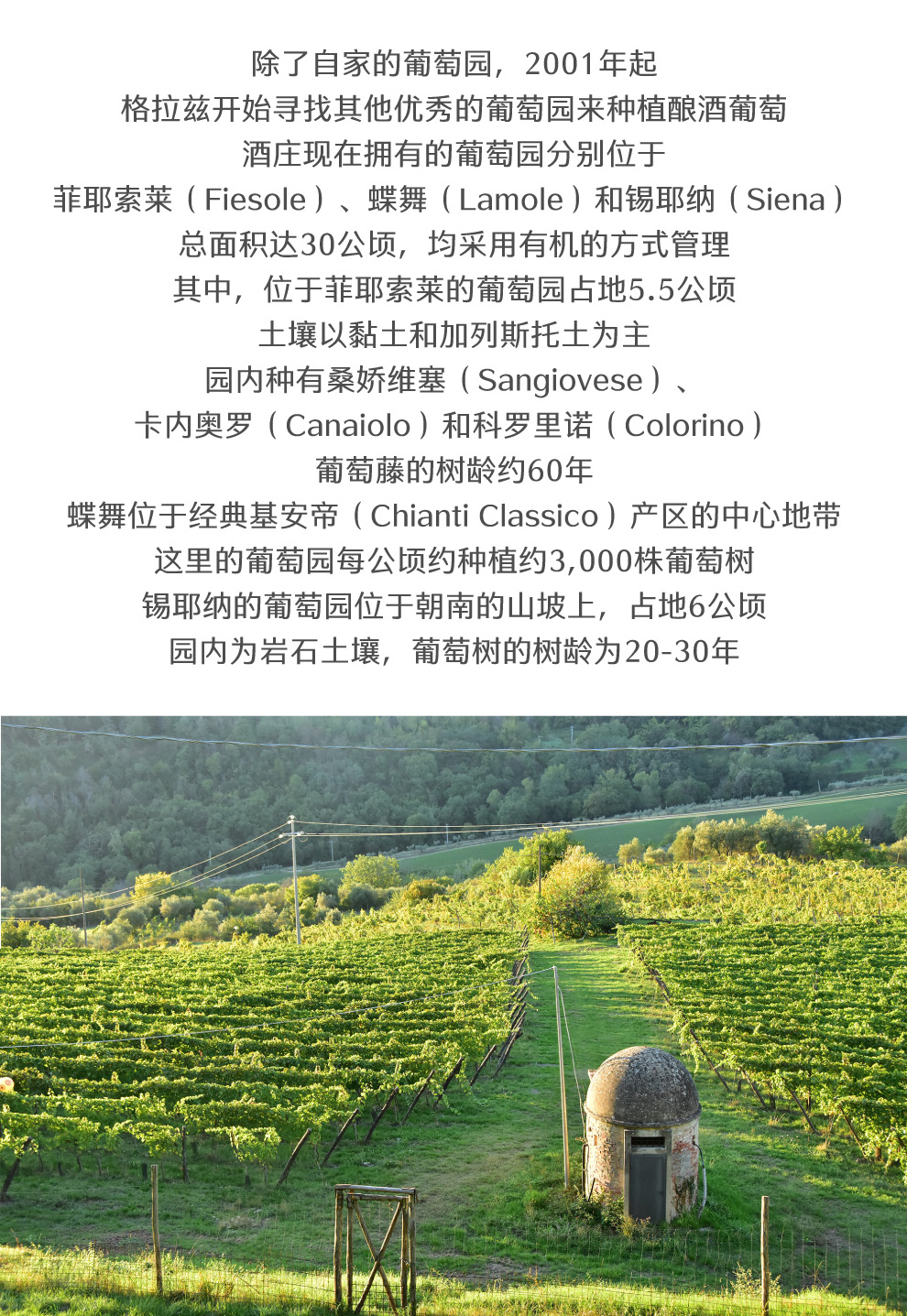 除了自家的葡萄园,2001年起,格拉兹开始寻找其他优秀的葡萄园来种植酿酒葡萄。酒庄现在拥有的葡萄园分别位于菲耶索莱(Fiesole)、蝶舞(Lamole)和锡耶纳(Siena),总面积达30公顷,均采用有机的方式管理。其中,位于菲耶索莱的葡萄园占地5.5公顷,土壤以黏土和加列斯托土为主,园内种有桑娇维塞(Sangiovese)、卡内奥罗(Canaiolo)和科罗里诺(Colorino),葡萄藤的树龄约60年。蝶舞位于经典基安帝(Chianti Classico)产区的中心地带,这里的葡萄园每公顷约种植约3,000株葡萄树。锡耶纳的葡萄园位于朝南的山坡上,占地6公顷,园内为岩石土壤,葡萄树的树龄为20-30年。
