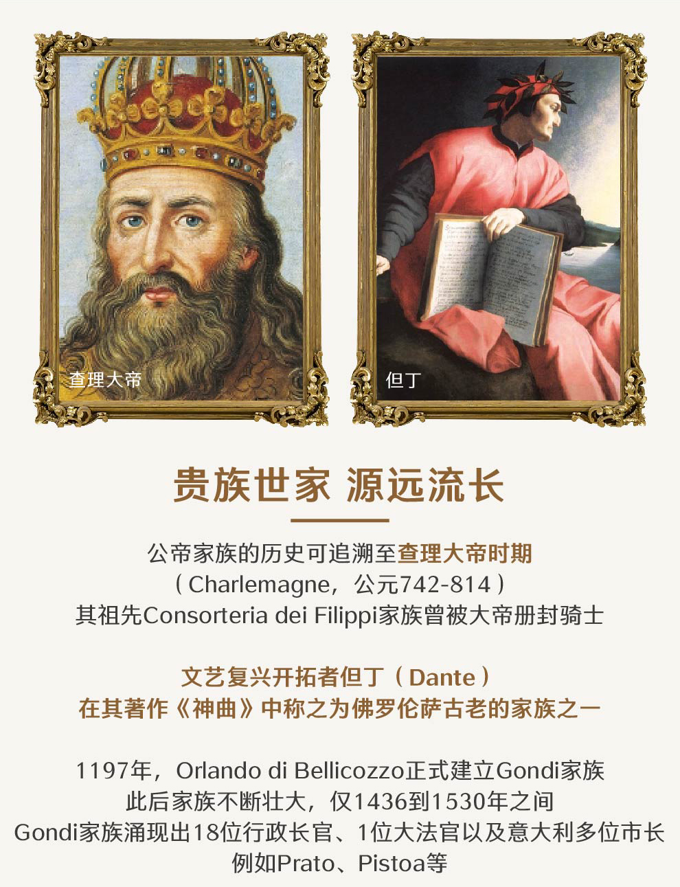 文艺复兴开拓者但丁(Dante)在其著作《神曲》中称之为佛罗伦萨最古老的家族之一。