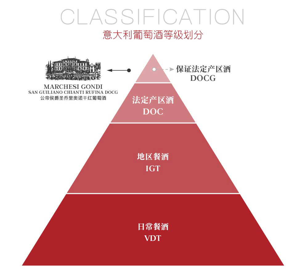 除了上述卓越的DOCG、DOC等级的酒,此地很多IGT和VdT等级的葡萄酒同样令人印象深刻。某一类的IGT,其实是最高质量的意大利酒,例如皮埃蒙特(Piedmont)或托斯卡纳属于此等级的优质葡萄酒,就在全球都享有极高的声誉。意大利关于葡萄酒有严格的法律规定——酒庄使用外国葡萄(如法国的赤霞珠)酿成的酒,即使品质很高,也不能使用更高的等级(如后面所提的DOC或DOCG),只能用IGT甚至VDT。意大利许多备受赞誉的优质佳酿都没有相应的等级映衬,这无不体现出意大利葡萄酒分级制度的尴尬。这些“名小于实”的葡萄酒大多来自托斯卡纳,专家们将其称为“超级托斯卡纳(Super Tuscany)”,在葡萄酒界几乎无人不晓。