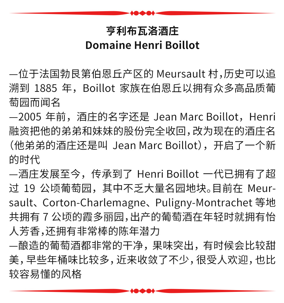 亨利布瓦洛酒庄的历史最早可以追溯到1885年。从那时起,亨利布瓦洛家族就已经开始种植葡萄树并酿酒了。布瓦洛酒庄原名是“Domaine Jean Boillot”,根据亨利布瓦洛家族第四代传人让·布瓦洛(Jean Boillot)的名字命名。2005年,让·布瓦洛的儿子亨利·布瓦洛(Henry Boillot)将其他兄妹名下的产业股权买了下来,并将这些产业重新整合为一个酒庄,最后改名为“Domaine Henri Boillot”。酒庄目前的庄主亨利·布瓦洛是布瓦洛家族的第五代传人。近几年,他的儿子吉月莫(Guillaume)也加入到酒庄的经营中来。