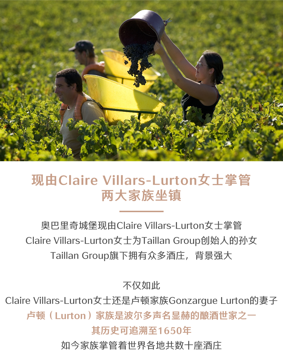 然而,直到1983年Villars家族的到来,奥巴里奇城堡才真正再现了昔日的光辉。目前,酒庄由Claire Villars女士经营。她对葡萄酒酿造设备进行了全面的翻新,并且采用了新的方式来保护环境。