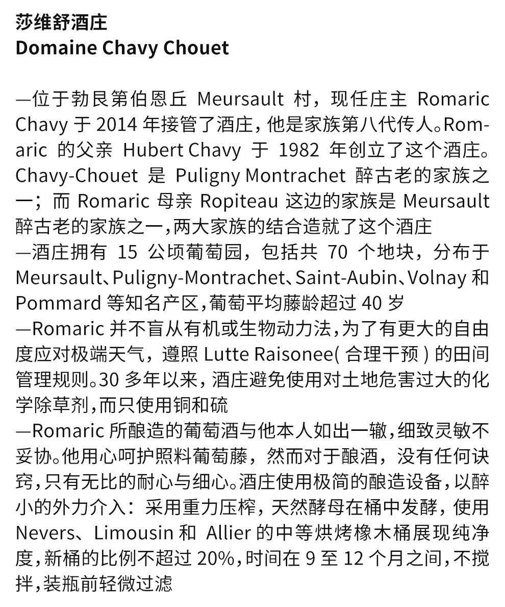 莎维舒酒庄(DOMAINE CHAVY CHOUET)是位于默尔索村(Meursault)的精品家族酒庄,是勃艮第产区盛产高品质葡萄酒的知名酒庄。