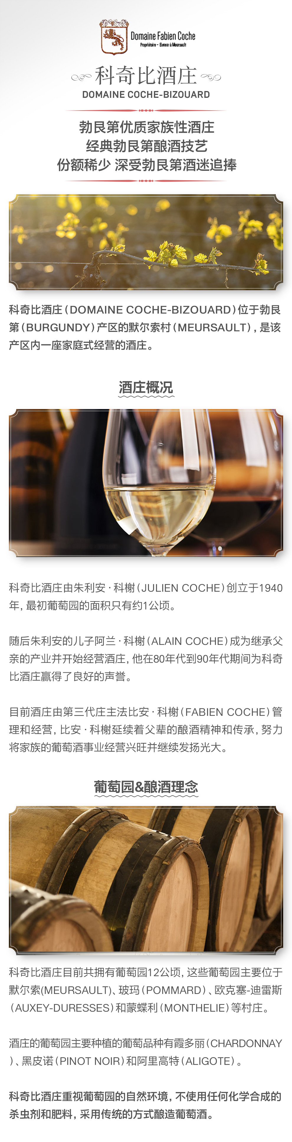 科奇比酒庄(Domaine Coche-Bizouard)位于勃艮第(Burgundy)产区的默尔索村(Meursault),是该产区内一座家庭式经营的酒庄。
