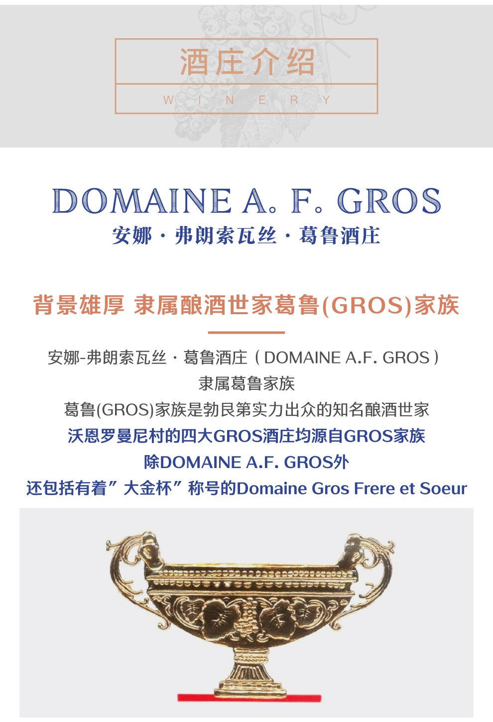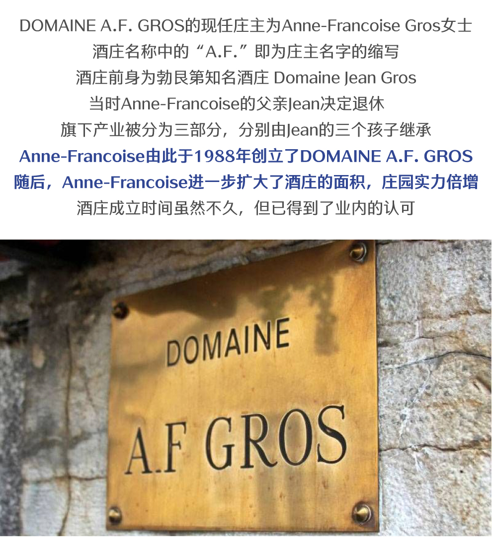安娜芳华葛鲁酒庄(Domaine A. F. Gros)位于法国勃艮第(Burgundy)伯恩丘(Cote de Beaune)产区,是该产区内一座精品酒庄。AF酒庄的前身是让·葛鲁(Jean Gros)和珍妮·葛鲁(Jeanine Gros)夫妇共同创建的葛鲁-雷诺多(Gros-Renaudot)酒庄。