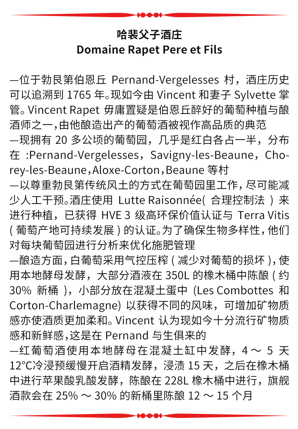 哈裴父子酒庄的历史可以追溯到1765年,酒庄现庄主从1990年开始继承父亲Robert Rapet的产业,和酿酒师Vincent Rapet努力经营酒庄。