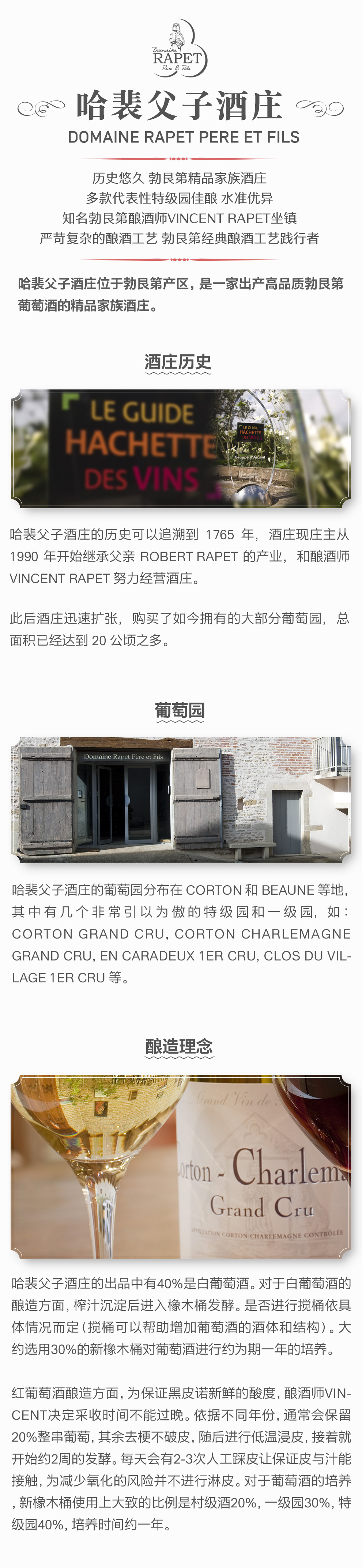 哈裴父子酒庄的历史可以追溯到1765年,酒庄现庄主从1990年开始继承父亲Robert Rapet的产业,和酿酒师Vincent Rapet努力经营酒庄。