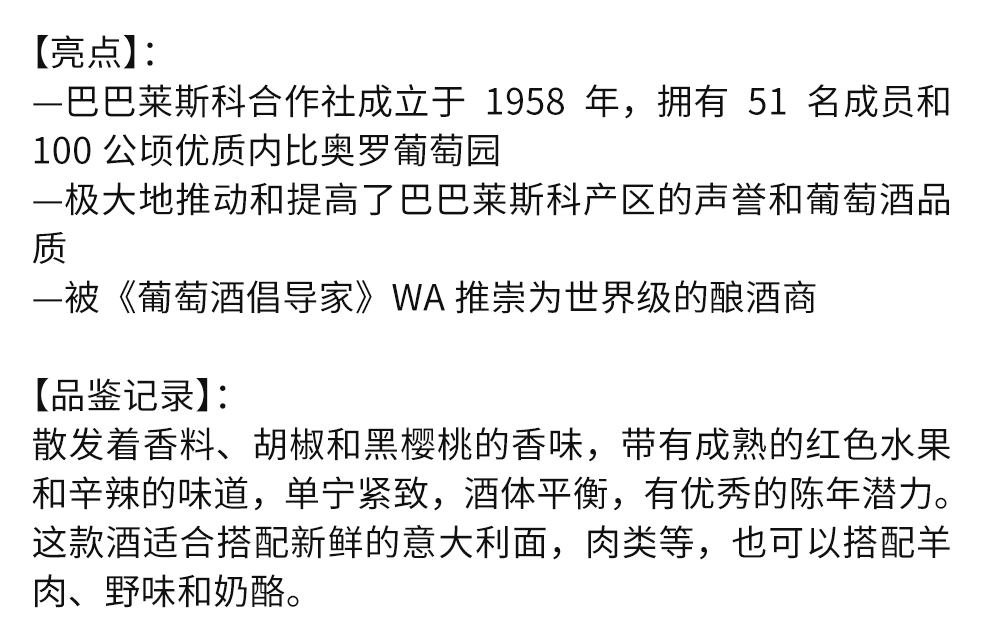 巴巴莱斯科产区酿酒合作社成立于1958年,目前拥有51名成员,在巴巴莱斯科拥有约100公顷(250英亩)的优质内比奥罗葡萄园。