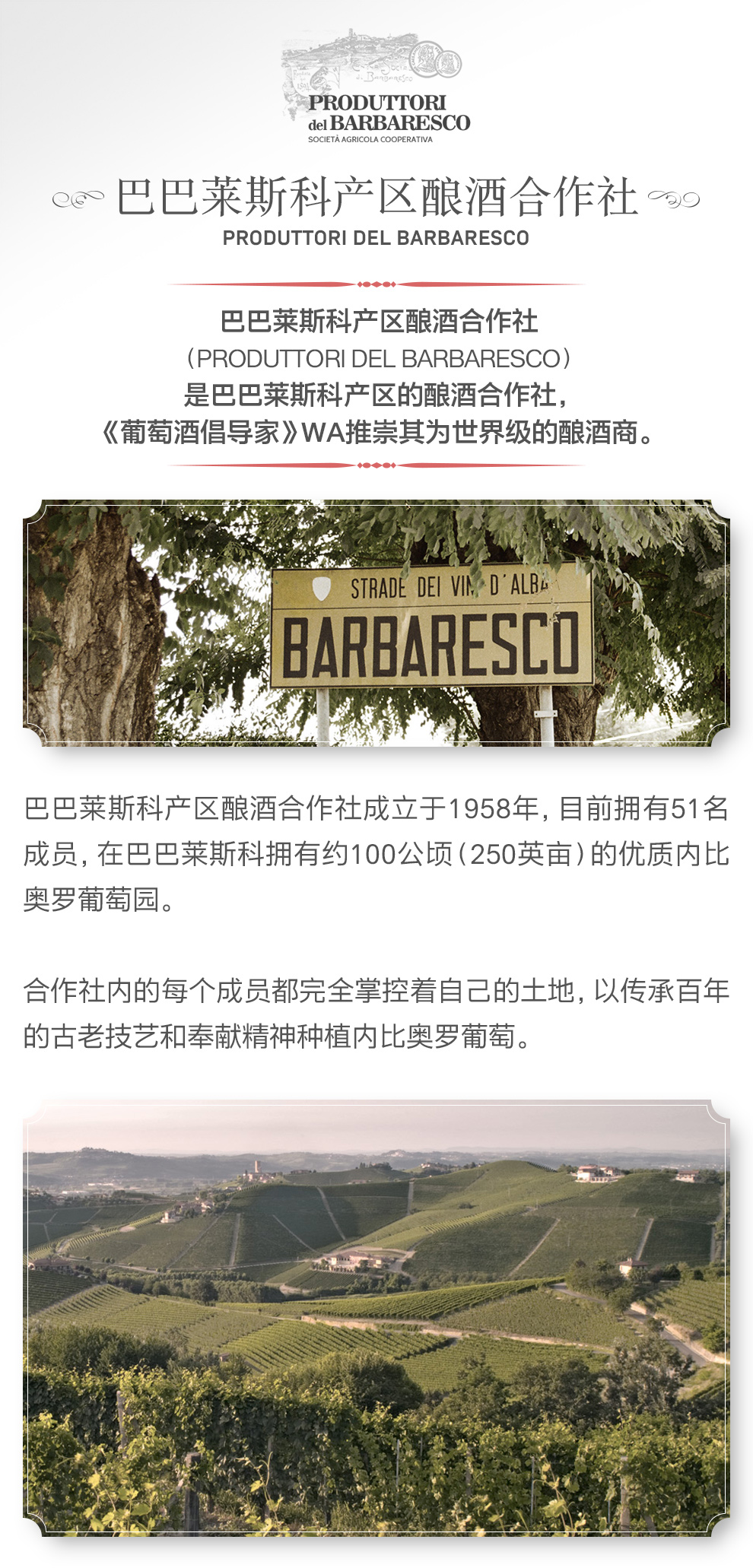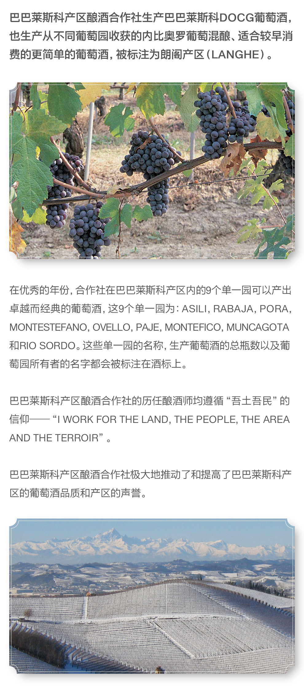 巴巴莱斯科产区酿酒合作社成立于1958年,目前拥有51名成员,在巴巴莱斯科拥有约100公顷(250英亩)的优质内比奥罗葡萄园。