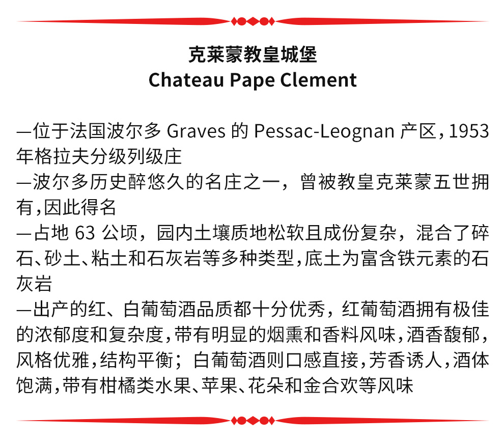 不懈的努力,不断地自省,卓越的产地,这一切都是Château Pape Clément (克莱蒙教皇堡)不断进步的原因所在,正因如此,我们才能每年为红酒爱好者们带来一个又一个惊喜。