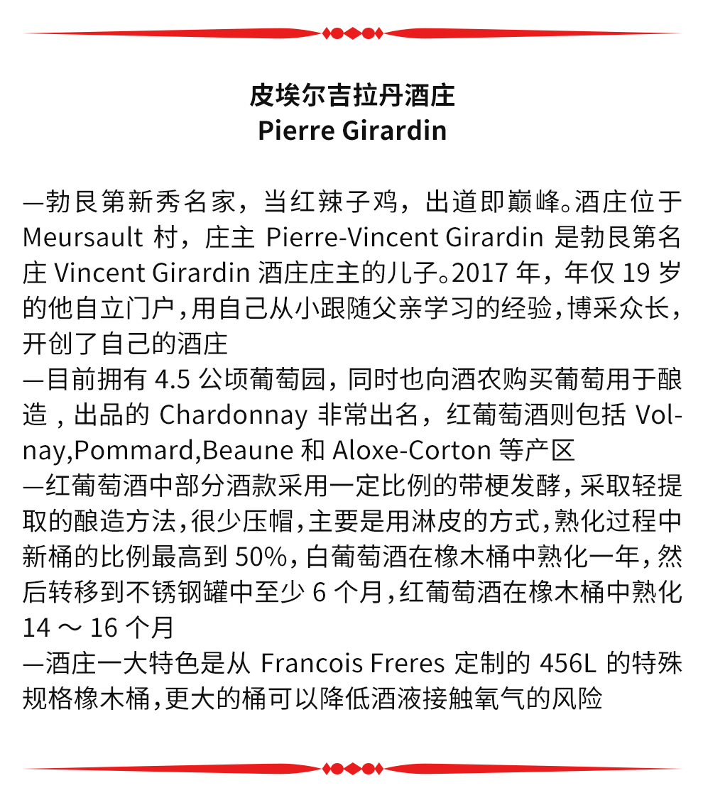 天才酿酒师皮埃尔·吉拉丹虽然年轻,但近些年他做的葡萄酒已经博得了许多关注勃艮第葡萄酒爱好者的眼球。相比于他父亲文森特·吉拉丹( Vincent Girardin),似乎他做出的酒更有创造力,有独特的酿酒风格。不同于有些老派的酿酒师会保持每年的酒风格一致,皮埃尔·吉拉丹酿造的葡萄酒常常留给大家更多的变化和期待。