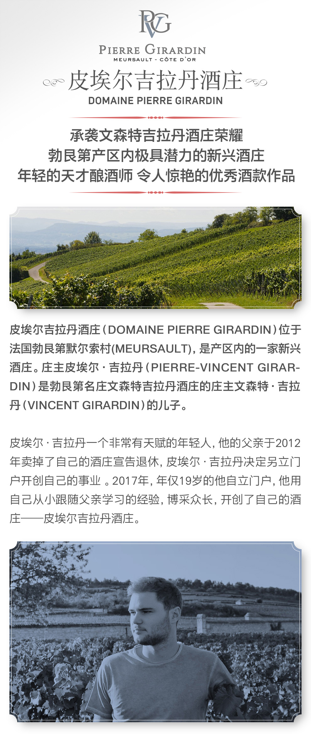 皮埃尔吉拉丹酒庄(DOMAINE PIERRE GIRARDIN)位于法国勃艮第默尔索村(Meursault),是产区内的一家新兴酒庄。庄主皮埃尔·吉拉丹(Pierre-Vincent Girardin)是勃艮第名庄文森特吉拉丹酒庄的庄主文森特·吉拉丹(Vincent Girardin)的儿子。