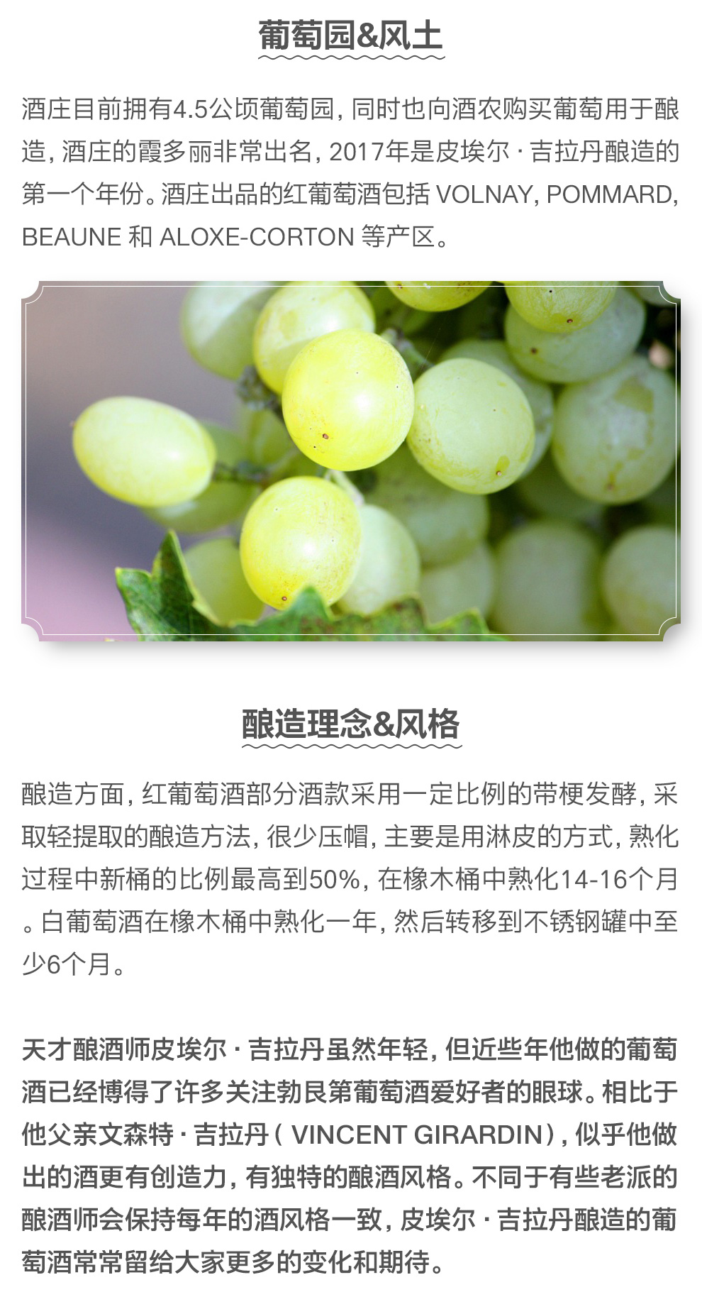 天才酿酒师皮埃尔·吉拉丹虽然年轻,但近些年他做的葡萄酒已经博得了许多关注勃艮第葡萄酒爱好者的眼球。相比于他父亲文森特·吉拉丹( Vincent Girardin),似乎他做出的酒更有创造力,有独特的酿酒风格。不同于有些老派的酿酒师会保持每年的酒风格一致,皮埃尔·吉拉丹酿造的葡萄酒常常留给大家更多的变化和期待。