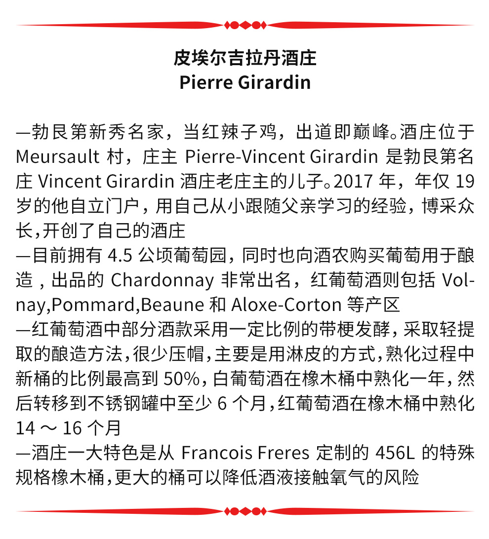 天才酿酒师皮埃尔·吉拉丹虽然年轻,但近些年他做的葡萄酒已经博得了许多关注勃艮第葡萄酒爱好者的眼球。相比于他父亲文森特·吉拉丹( Vincent Girardin),似乎他做出的酒更有创造力,有独特的酿酒风格。不同于有些老派的酿酒师会保持每年的酒风格一致,皮埃尔·吉拉丹酿造的葡萄酒常常留给大家更多的变化和期待。