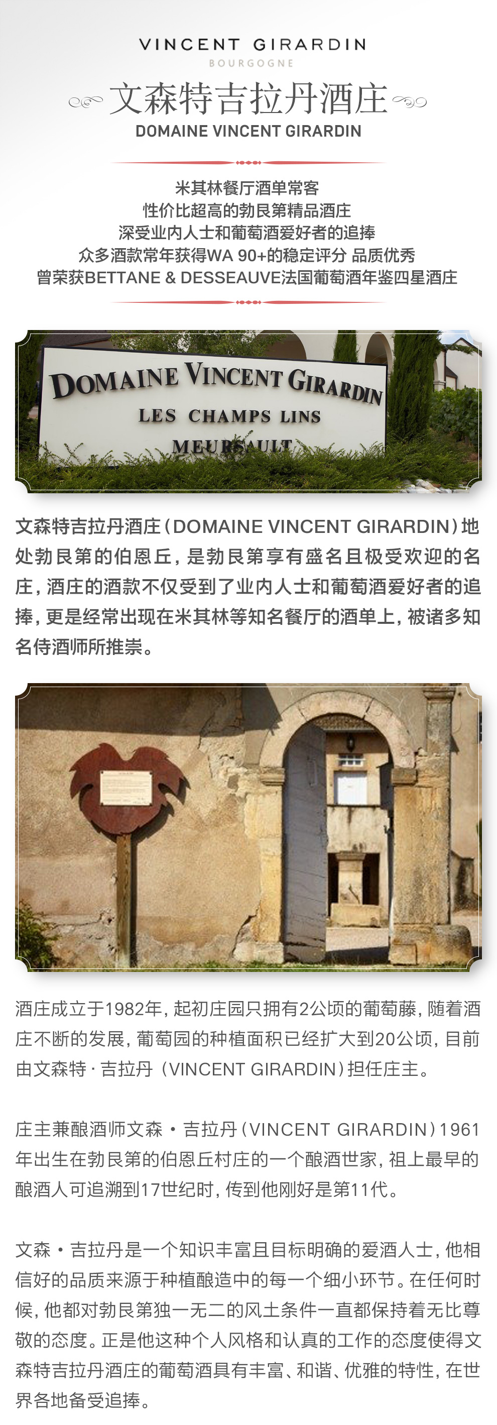 文森特吉拉丹酒庄(Domaine Vincent Girardin)地处勃艮第的伯恩丘,是勃艮第享有盛名且极受欢迎的名庄,酒庄的酒款不仅受到了业内人士和葡萄酒爱好者的追捧,更是经常出现在米其林等知名餐厅的酒单上,被诸多知名侍酒师所推崇。