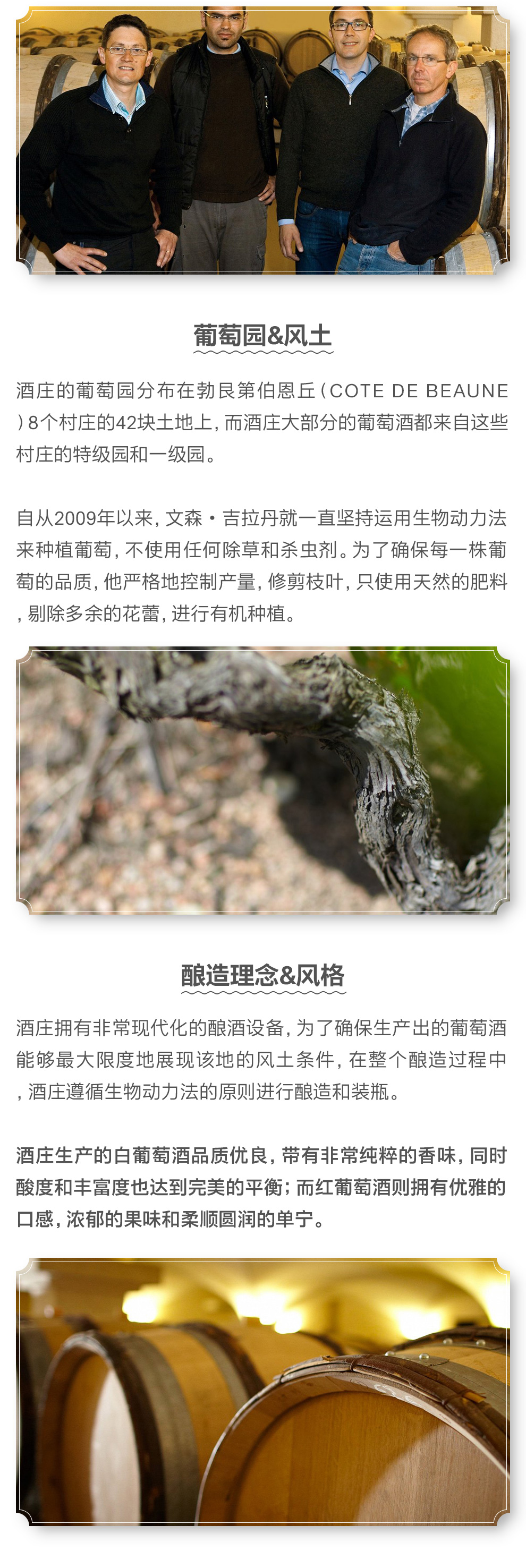 庄主兼酿酒师文森•吉拉丹(Vincent Girardin)1961年出生在勃艮第的伯恩丘村庄的一个酿酒世家,祖上最早的酿酒人可追溯到17世纪时,传到他刚好是第11代。文森•吉拉丹是一个知识丰富且目标明确的爱酒人士,他相信好的品质来源于种植酿造中的每一个细小环节。在任何时候,他都对勃艮第独一无二的风土条件一直都保持着无比尊敬的态度。正是他这种个人风格和认真的工作的态度使得文森特吉拉丹酒庄的葡萄酒具有丰富、和谐、优雅的特性,在世界各地备受追捧。
