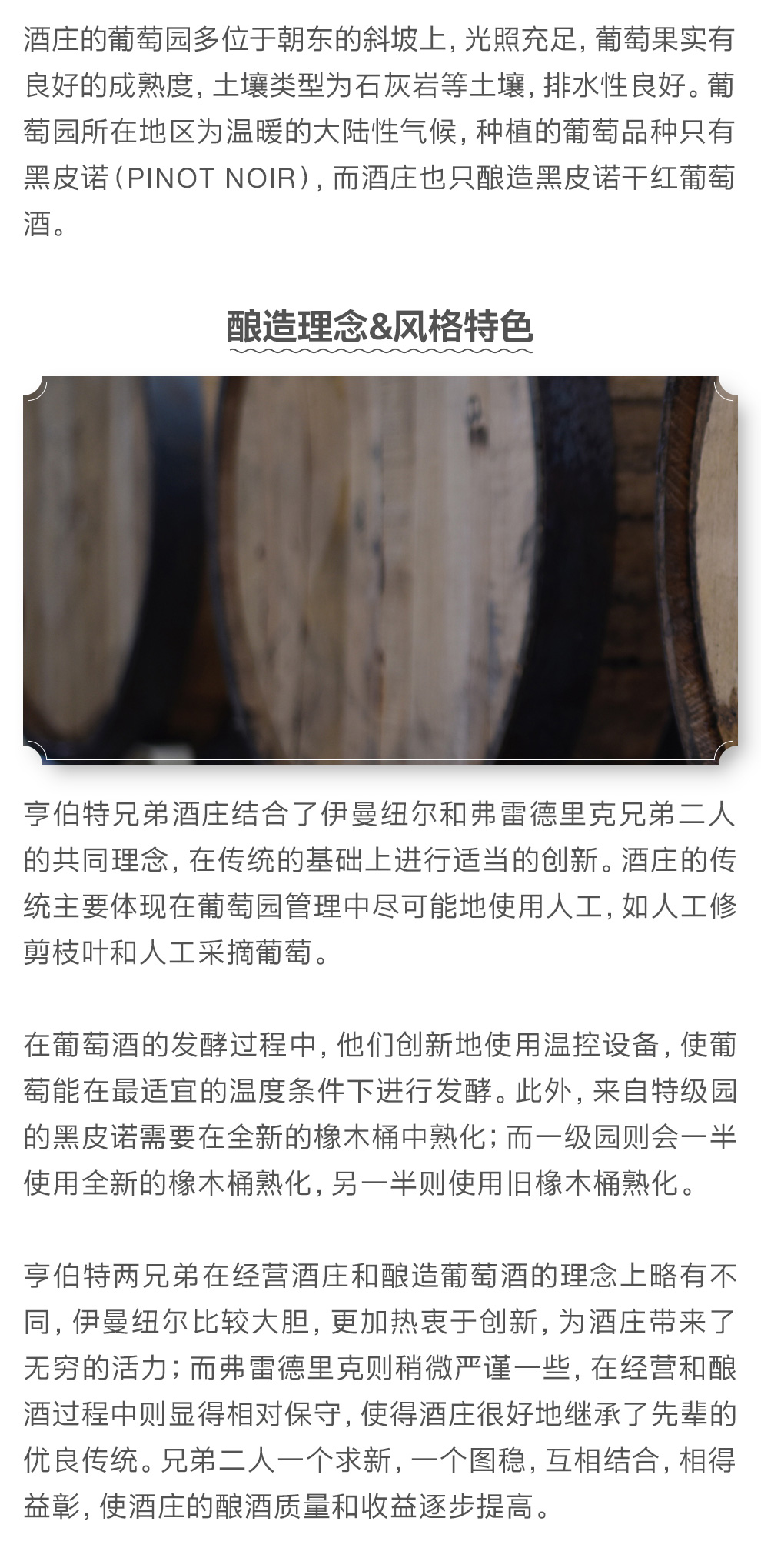 在葡萄酒的发酵过程中,他们创新地使用温控设备,使葡萄能在最适宜的温度条件下进行发酵。此外,来自特级园的黑皮诺需要在全新的橡木桶中熟化;而一级园则会一半使用全新的橡木桶熟化,另一半则使用旧橡木桶熟化。